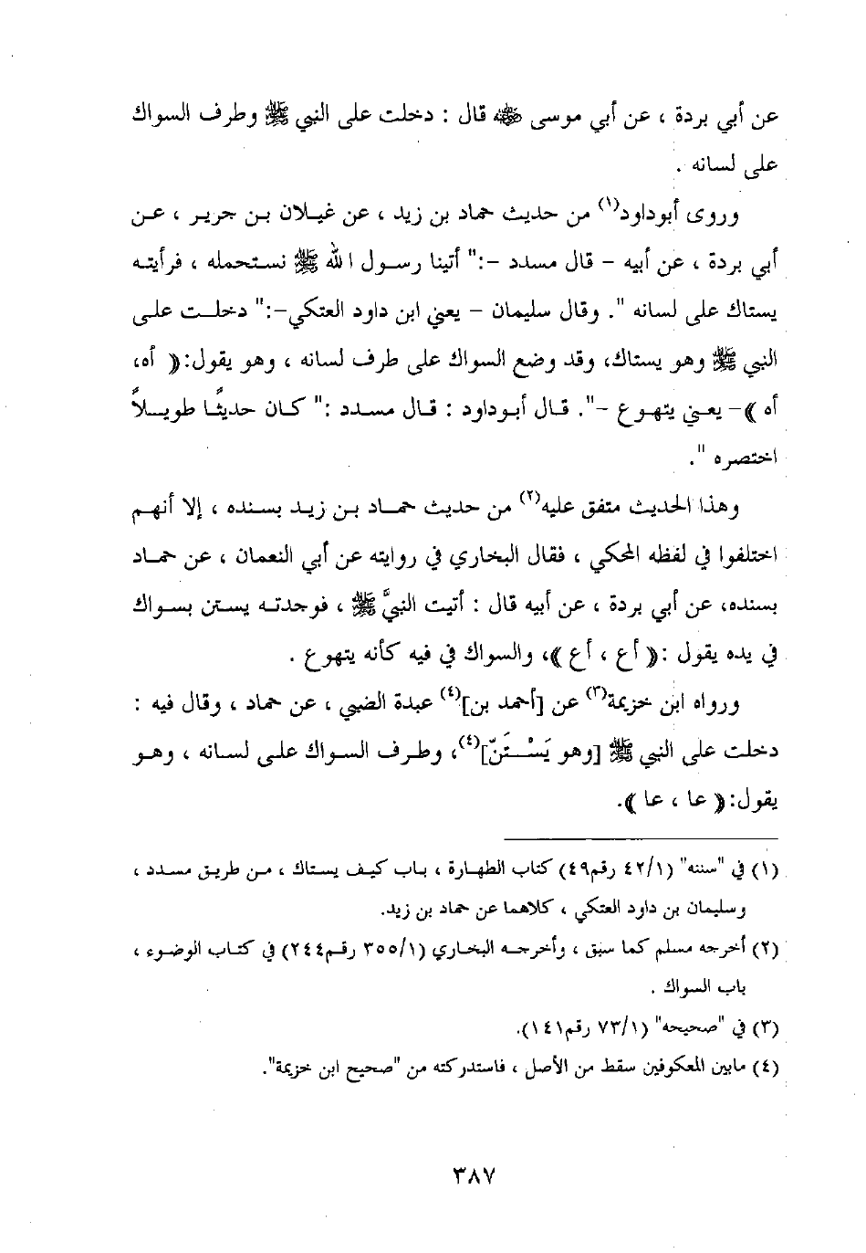 وهذا الحديث متفق عليه من حديث حماد بن زيد بسنده، إلا أنهم اختلفوا في لفظه المحكي، فقال البخاري في روايته عن أبي النعمان، عن حماد بسنده، عن أبي بردة، عن أبيه قال: أتيت النبي صلى الله عليه وسلم، فوجدته يستن بسواك في يده يقول: "أع أع"، والسواك في فيه كأنه يتهوع.