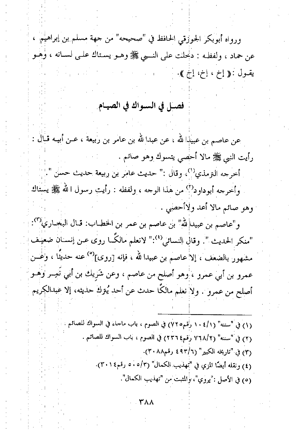 عن عاصم بن عبيد الله، عن عبد الله بن عامر بن ربيعة، عن أبيه قال: رأيت النبي صلى الله عليه وسلم ما لا أحصي يتسوك وهو صائم.