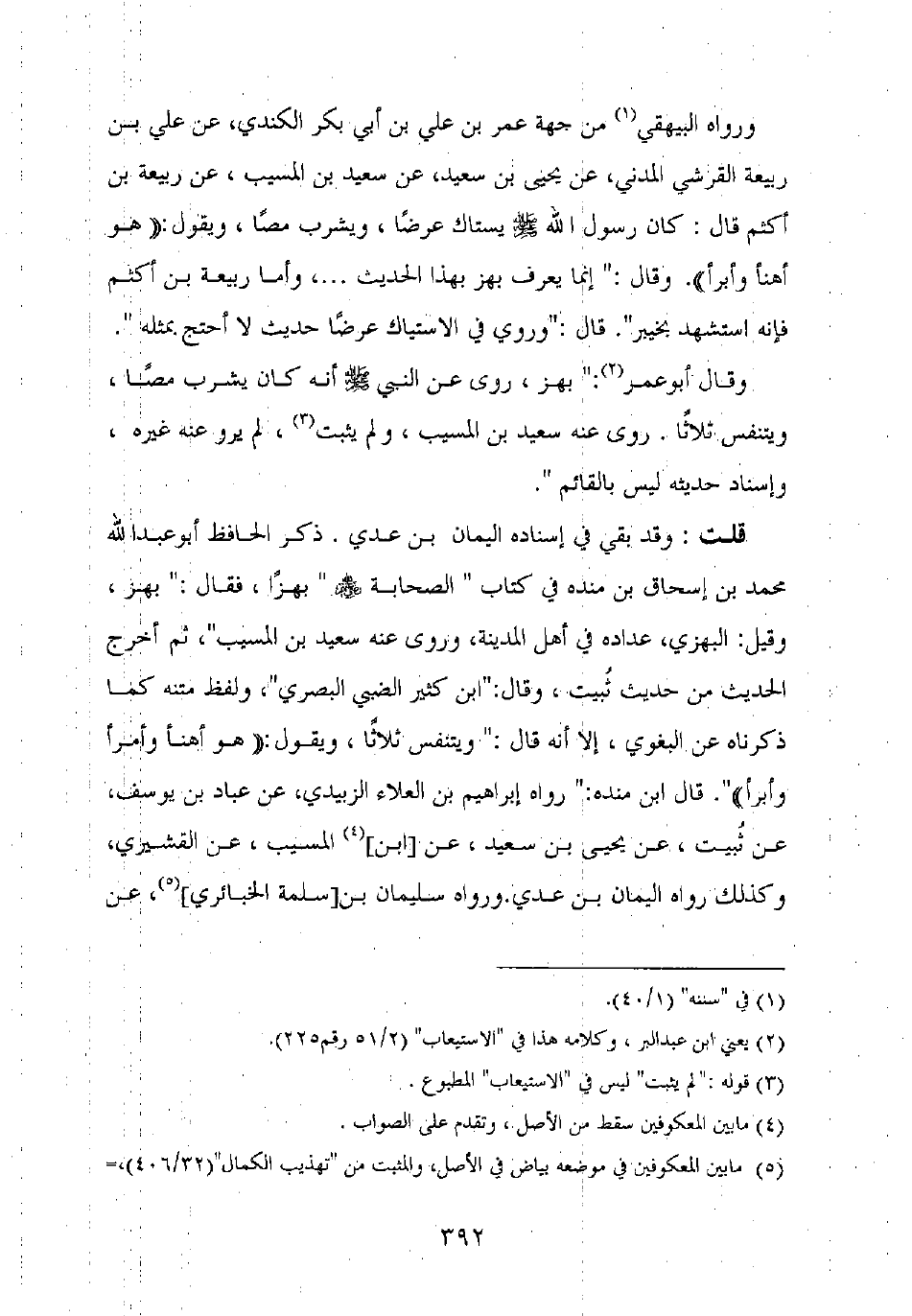 وقال أبو عمر: "بهز، روى عن النبي صلى الله عليه وسلم أنه كان يشرب مصا، ويتنفس ثلاثا. روى عنه سعيد بن المسيب، ولم يثبت، لم يرو عنه غيره، وإسناد حديثه ليس بالقائم".