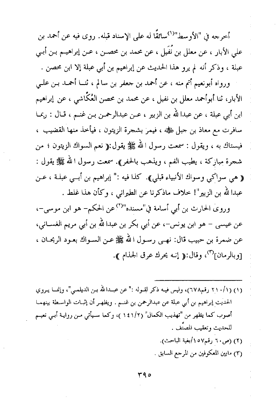 ورواه أبو نعيم أتم منه، عن أحمد بن جعفر بن سالم، ثنا أحمد بن علي الأبار، ثنا أبو أحمد معلل بن نفيل، عن محمد بن محصن العكاشي، عن إبراهيم بن أبي عبلة، عن عبد الله بن الزبير، عن عبد الرحمن بن غنم، قال: ربما سافرت مع معاذ بن جبل رضي الله عنه، فيمر بشجرة الزيتون، فيأخذ منها القضيب، فيستاك به، ويقول: سمعت رسول الله صلى الله عليه وسلم يقول: "نعم السواك الزيتون، من شجرة مباركة، يطيب الفم، ويذهب بالحفر". سمعت رسول الله صلى الله عليه وسلم يقول: "هي سواكي وسواك الأنبياء قبلي". كذا فيه: "إبراهيم بن أبي عبلة، عن عبد الله بن الزبير"! خلاف ما ذكرنا عن الطبراني، وكأن هذا غلط.