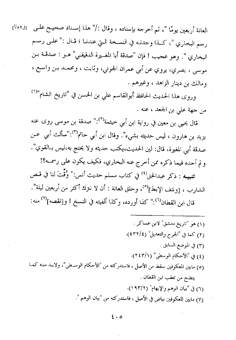 العانة أربعين يوما "، ثم أخرجه بإسناده، وقال: "هذا إسناد صحيح على رسم البخاري"، كذا وجدته في النسخة التي عندنا، قال "على رسم البخاري". وهو عجيب! فإن "صدقة أبا المغيرة الدقيقي" هو: صدقة بن موسى، بصري، يروي عن أبي عمران الجوني، وثابت، ومحمد بن واسع، ومالك بن دينار الزاهد، وغيرهم.