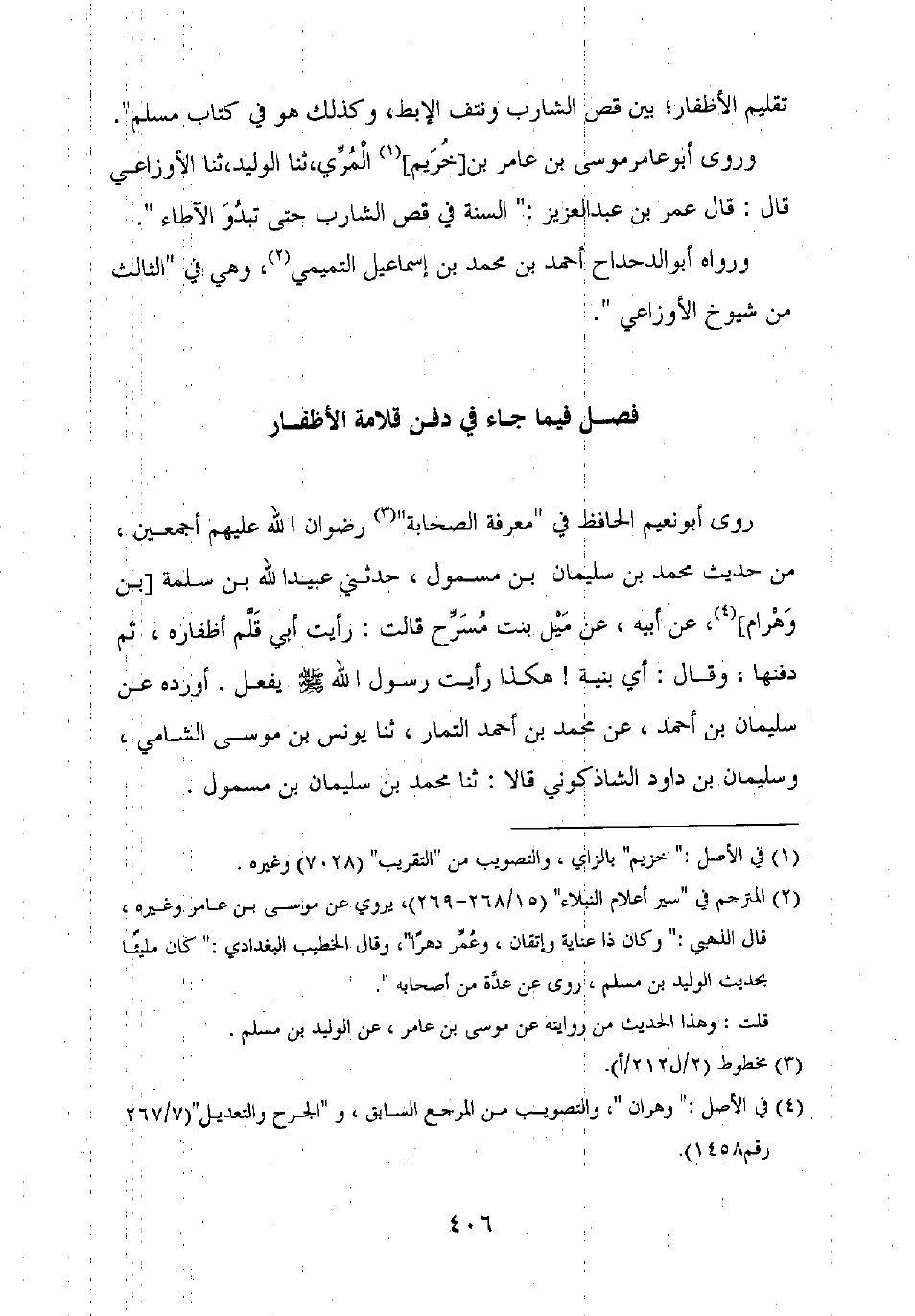وروى أبو عامر موسى بن عامر بن [خريم] المري، ثنا الوليد، ثنا الأوزاعي قال: قال عمر بن عبد العزيز: "السنة في قص الشارب حتى تبدو الاطاء".