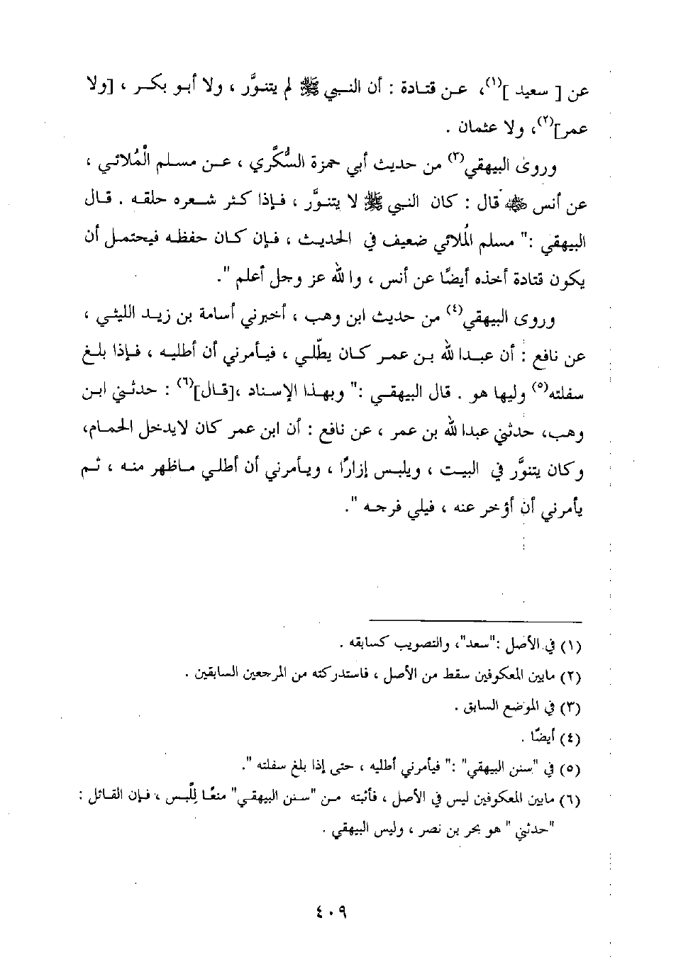وروي البيهقي من حديث أبي حمزة السكري، عن مسلم الملائي، عن أنس رضي الله عنه قال: كان النبي صلى الله عليه وسلم لا يتنور، فإذا كثر شعره حلقه. قال البيهقي: "مسلم االملائي ضعيف في الحديث، فإن كان حفظه فيحتمل أن يكون قتادة أخذه أيضا عن أنس، والله عز وجل أعلم".
