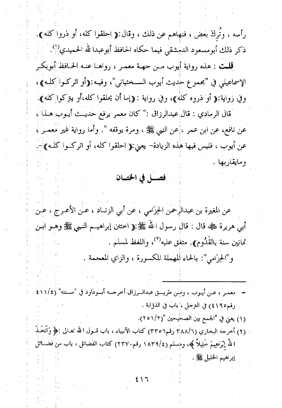 قال الرمادي: قال عبد الرزاق: "كان معمر يرفع حديث أيوب هذا، عن نافع عن ابن عمر، عن النبي صلى الله عليه وسلم، ومرة يوقفه". وأما رواية غير معمر، عن أيوب، فليس فيها هذه الزيادة – يعني: "احلقوا كله، أو اتركوا كله".