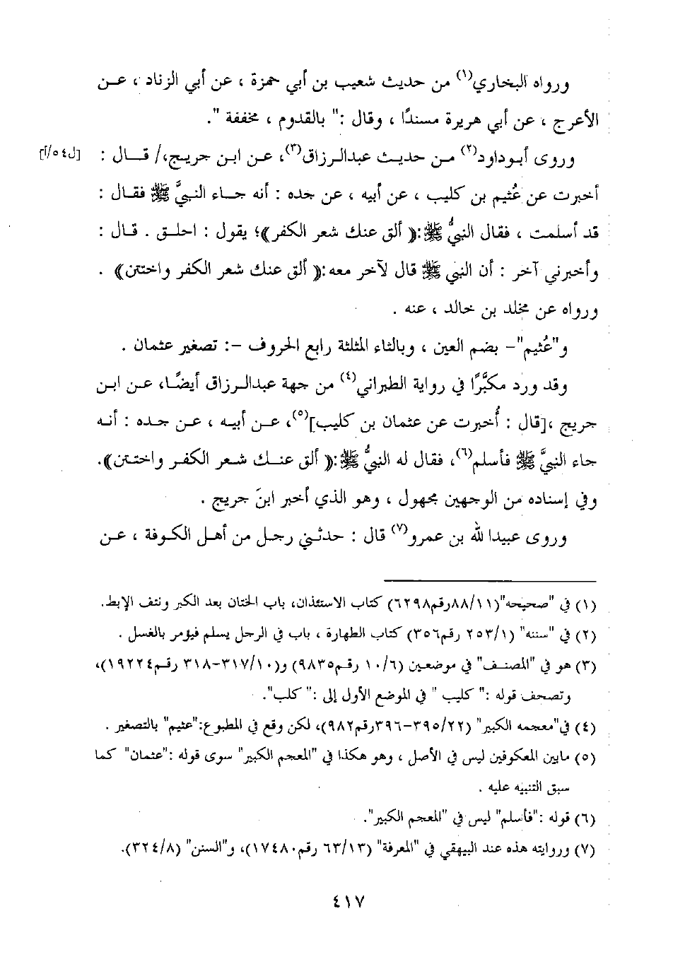 وروى أبو داود من حديث عبد الرزاق، عن ابن جريج قال: أخبرت عن عثيم بن كليب، عن أبيه، عن جده: أنه جاء النبي صلى الله عليه وسلم فقال: قد أسلمت، فقال النبي صلى الله عليه وسلم: "ألق عنك شعر الكفر"، يقول: احلق. قال: وأخبرني آخر: أن النبي صلى الله عليه وسلم قال لآخر معه: "ألق عنك شعر الكفر واختتن".