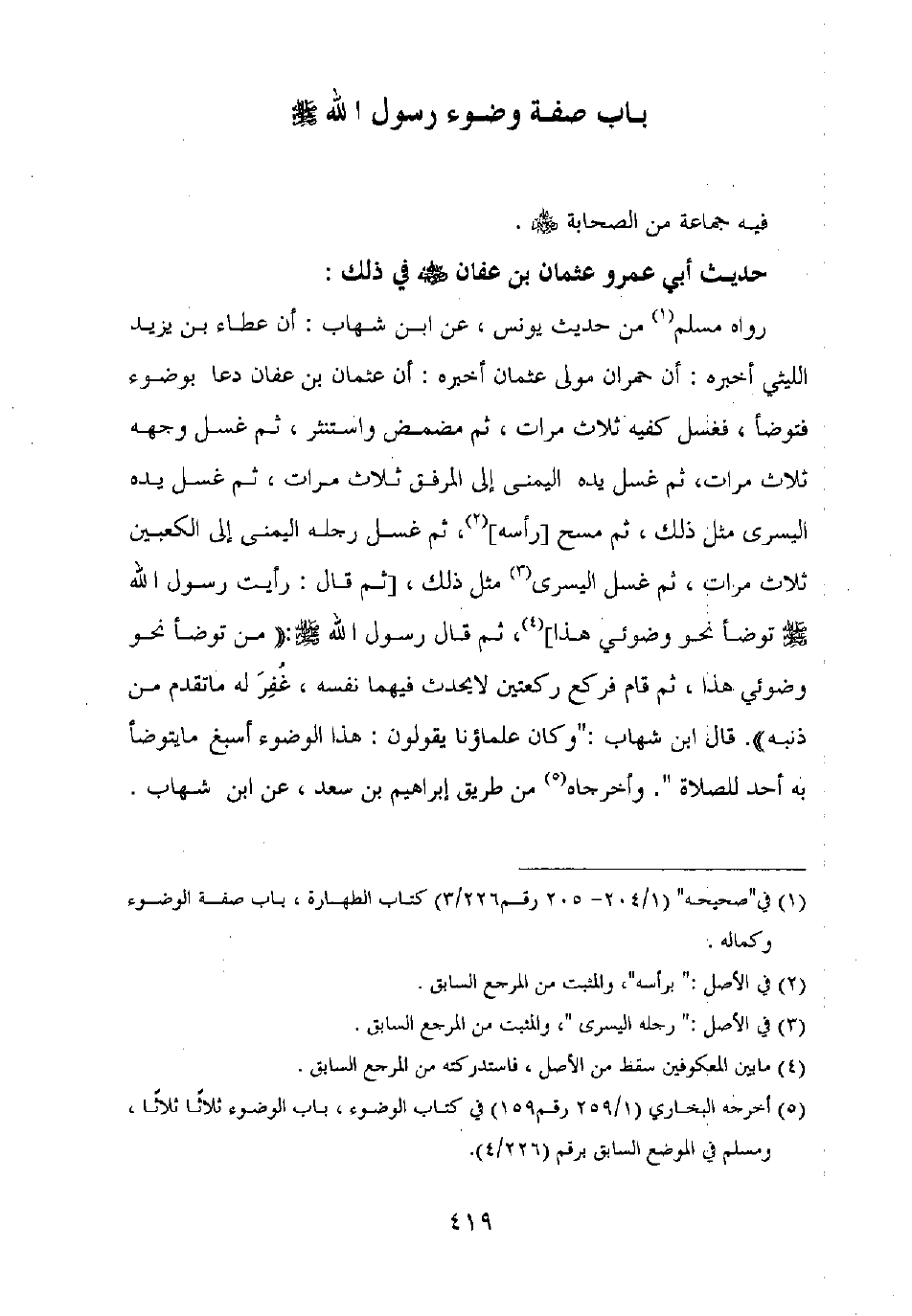 رواه مسلم من حديث يونس، عن ابن شهاب: أن عطاء بن يزيد الليثي أخبره: أن حمران مولى عثمان أخبره: أن عثمان بن عفان دعا بوضوء فتوضأ، فغسل كفيه ثلاث مرات، ثم مضمض واستنثر، ثم غسل وجهه ثلاث مرات، ثم غسل يده اليمنى إلى المرفق ثلاث مرات، ثم غسل يده اليسرى مثل ذلك، ثم مسح [رأسه]، ثم غسل رجله اليمنى إلى الكعبين ثلاث مرات، ثم غسل اليسرى مثل ذلك، [ثم قال: رأيت رسول الله صلى الله عليه وسلم توضأ نحو وضوئي هذا]، ثم قال رسول الله صلى الله عليه وسلم: "من توضأ نحو وضوئي هذا، ثم قام فركع ركعتين لا يحدث فيهما نفسه، غفر له ما تقدم من ذنبه". قال ابن شهاب: "وكان علماؤنا يقولون: هذا الوضوء اسبغ ما يتوضأ به أحد للصلاة". وأخرجاه من طريق إبراهيم بن سعد، عن ابن شهاب.