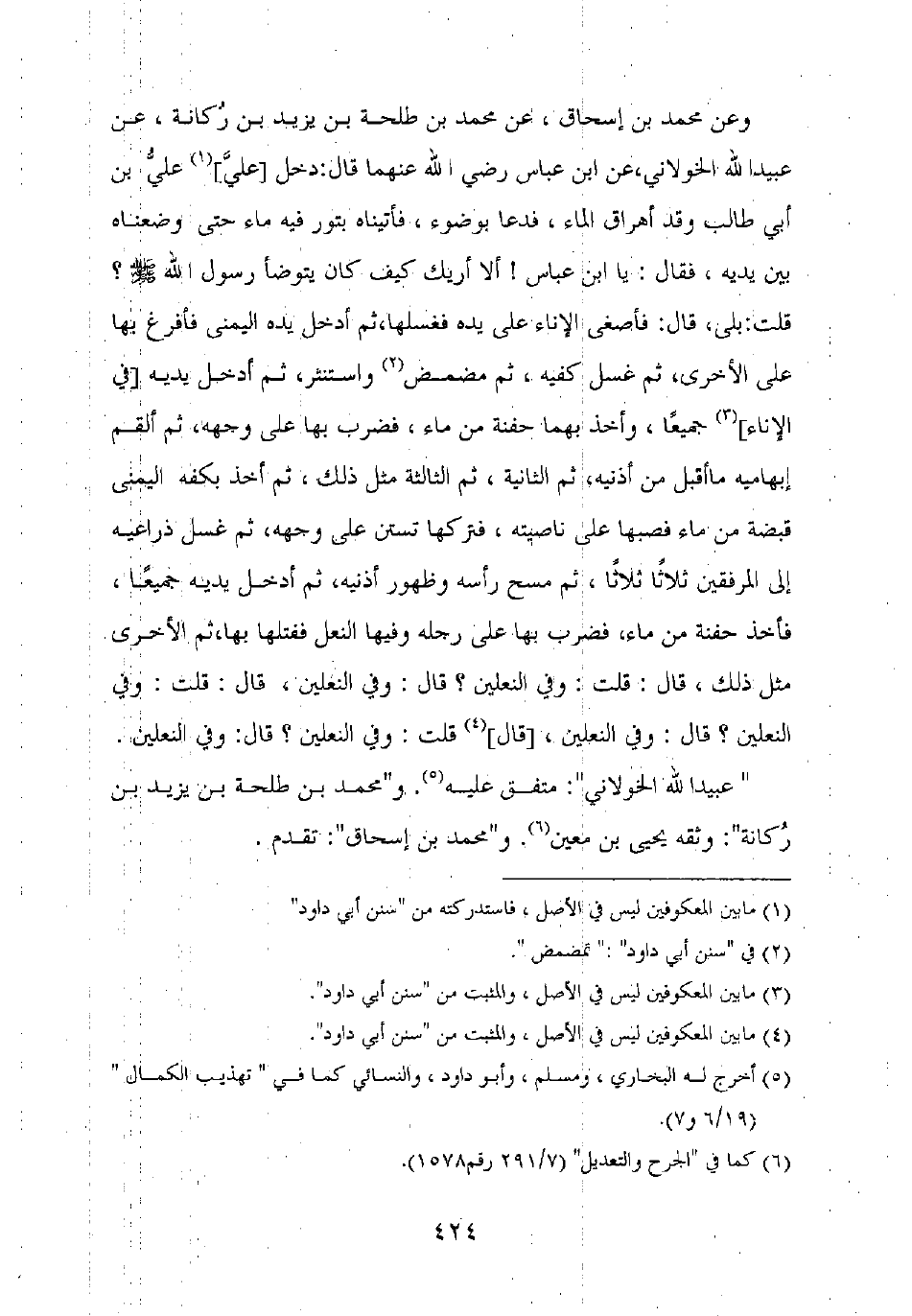 وعن محمد بن إسحاق، عن محمد بن طلحة بن يزيد بن ركانة، عن عبيد الله الخولاني، عن ابن عباس رضي الله عنهما قال: دخل [علي] علي بن أبي طالب وقد أهراق الماء، فدعا بوضوء، فأتيناه بتور فيه ماء حتى وضعناه بين يديه، فقال: يا ابن عباس! ألا أريك كيف كان يتوضأ رسول الله صلى الله عليه وسلم؟ قلت: بلى، قال: فأصغى الإناء على يده فغسلها، ثم أدخل يده اليمنى فأفرغ بها على الأخرى، ثم غسل كفيه، ثم مضمض واستنثر، ثم أدخل يديه [في الإناء] جميعا، وأخذ بهما حفنة من ماء، فضرب بها على وجهه، ثم ألقم إبهاميه ما أقبل من أذنيه، ثم الثانية، ثم الثالثة مثل ذلك، ثم أخذ بكفه اليمنى قبضة من ماء فصبها على ناصيته، فتركها تستن على وجهه، ثم غسل ذراعيه إلى المرفقين ثلاثا ثلاثا، ثم مسح رأسه وظهور أذنيه، ثم أدخل يديه جميعا، فأخذ حفنة من ماء، فضرب بها على رجله وفيها النعل ففتلها بها، ثم الأخرى مثل ذلك، قال: قلت: وفي النعلين؟ قال: وفي النعلين، قال: قلت: وفي النعلين؟ قال: وفي النعلين، [قال] قلت: وفي النعلين؟ قال: وفي النعلين.
