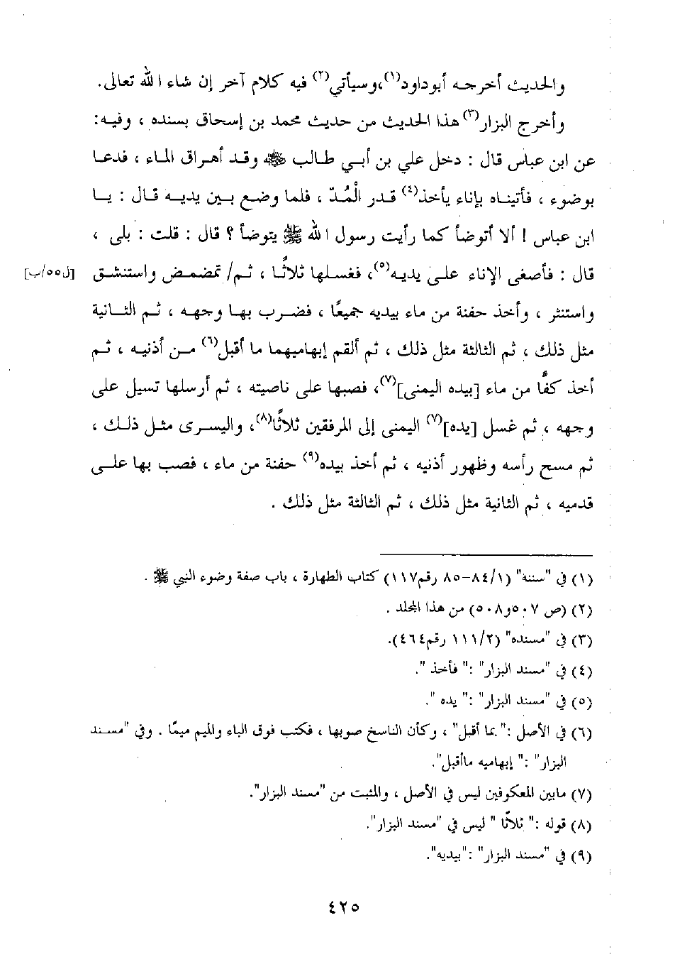 وأخرج البزار هذا الحديث من حديث محمد بن إسحاق بسنده، وفيه: عن ابن عباس قال: دخل علي بن أبي طالب رضي الله عنه وقد أهراق الماء، فدعا بوضوء، فأتيناه بإناء يأخذ قدر المد، فلما وضع بين يديه قال: يا ابن عباس! ألا أتوضأ كما رأيت رسول الله صلى الله عليه وسلم يتوضأ؟ قال: قلت: بلى، قال: فأصغى الإناء على يديه، فغسلها ثلاثا، ثم تمضمض واستنشق واستنثر، وأخذ حفنة من ماء بيديه جميعا، فضرب بها وجهه، ثم الثانية مثل ذلك، ثم الثالثة مثل ذلك، ثم ألقم إبهاميهما ما أقبل من أذنيه، ثم أخذ كفا من ماء [بيده اليمنى]، فصبها على ناصيته، ثم أرسلها تسيل على وجهه، ثم غسل [يده] اليمنى إلى المرفقين ثلاثا، واليسرى مثل ذلك، ثم مسح رأسه وظهور أذنيه، ثم أخذ بيده حفنة من ماء، فصب بها على قدميه ثم الثانية مثل ذلك، ثم الثالثة مثل ذلك.