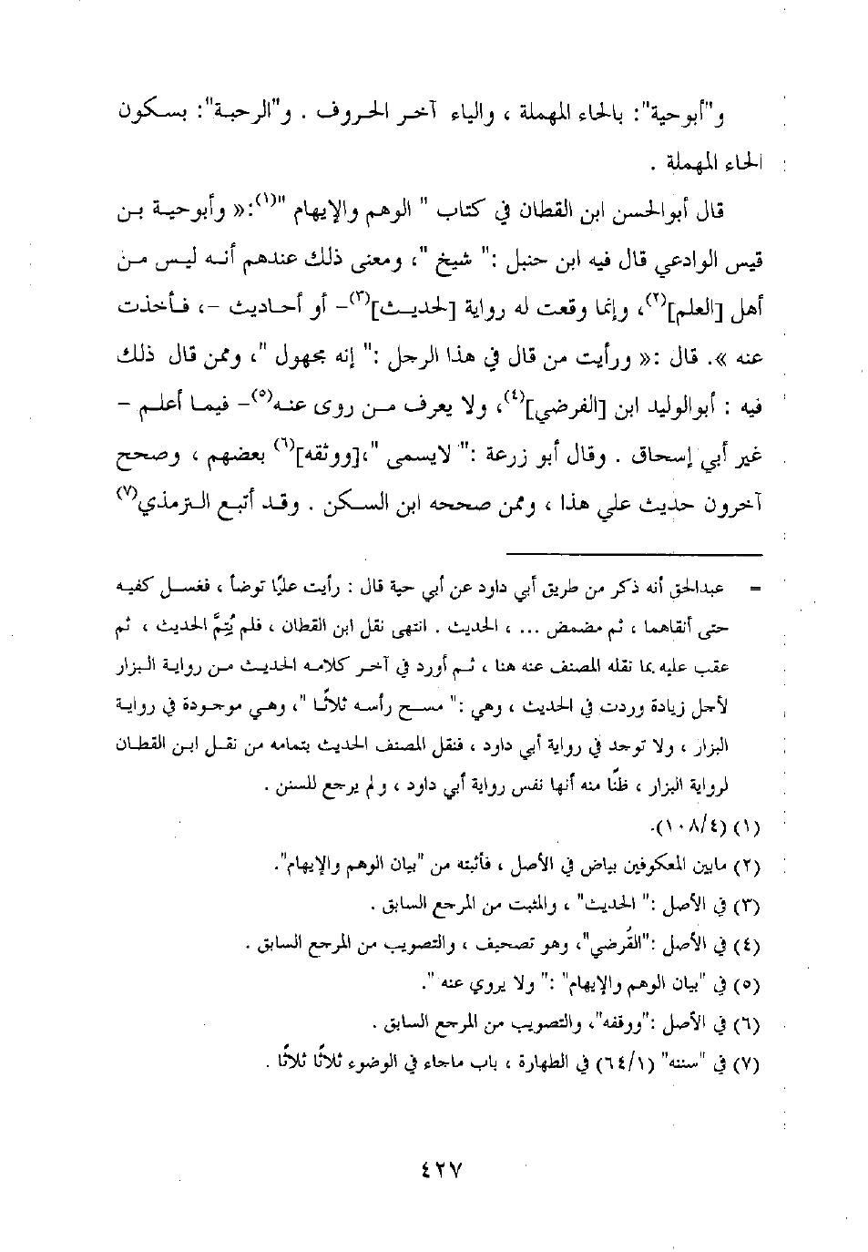 قال أبو الحسن ابن القطان في كتاب "الوهم والإيهام": "وأبو حية بن قيس الوادعي قال فيه ابن حنبل: "شيخ"، ومعنى ذلك عندهم أنه ليس من أهل العلم، وإنما وقعت له رواية [لحديث] – أو أحاديث –، فأخذت عنه ". قال: "ورأيت من قال في هذا الرجل: "إنه مجهول"، وممن قال ذلك فيه: أبو الوليد ابن [الفرضي]، ولا يعرف من روى عنه – فيما أعلم – غير أبي إسحاق. وقال أبو زرعة: "لا يسمى"، [ووثقه] بعضهم، وصحح آخرون حديث علي هذا، وممن صححه ابن السكن. وقد أتبع الترمذي