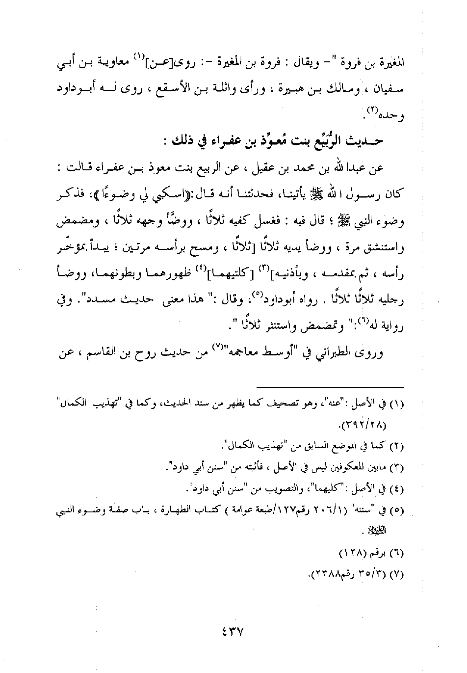 عن عبد الله بن محمد بن عقيل، عن الربيع بنت معوذ بن عفراء قالت: كان رسول الله صلى الله عليه وسلم يأتينا، فحدثتنا أنه قال: "اسكبي لي وضوءا"، فذكر وضوء النبي صلى الله عليه وسلم، قال فيه: فغسل كفيه ثلاثا، ووضأ وجهه ثلاثا، ومضمض واستنشق مرة، ووضأ يديه ثلاثا [ثلاثا، ومسح برأسه مرتين، يبدأ بمؤخر رأسه، ثم بمقدمه، وبأذنيه] [كلتيهما] ظهورهما وبطونهما، ووضأ رجليه ثلاثا ثلاثا. رواه أبو داود، وقال: "هذا معنى حديث مسدد". وفي رواية له: "وتمضمض واستنثر ثلاثا".