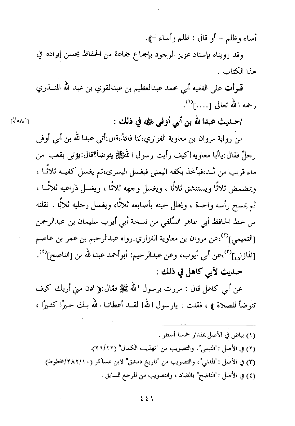 من رواية مروان بن معاوية الفزاري، ثنا فائد، قال: أتى عبد الله بن أبي أوفى رجل فقال: يا أبا معاوية! كيف رأيت رسول الله صلى الله عليه وسلم يتوضأ؟ قال: يؤتى بقعب من ماء قريب من مد، فيأخذ بكفه اليمنى فيغسل اليسرى، ثم يغسل كفيه ثلاثا ويمضمض ويستنشق ثلاثا ويغسل وجهه ثلاثا، ويغسل ذراعيه ثلاثا، ثم يمسح رأسه واحدة، ويخلل لحيته بأصابعه ثلاثا، ويغسل رجليه ثلاثا نقلته من خط الحافظ أبي طاهر السلفي من نسخة أبي أيوب سليمان بن عبد الرحمن [التميمي]، عن مروان بن معاوية الفزاري. رواه عبد الرحيم بن عمر بن عاصم [المازني]، عن أبي أيوب، وعن عبد الرحيم: أبو أحمد عبد الله بن [الناصح].