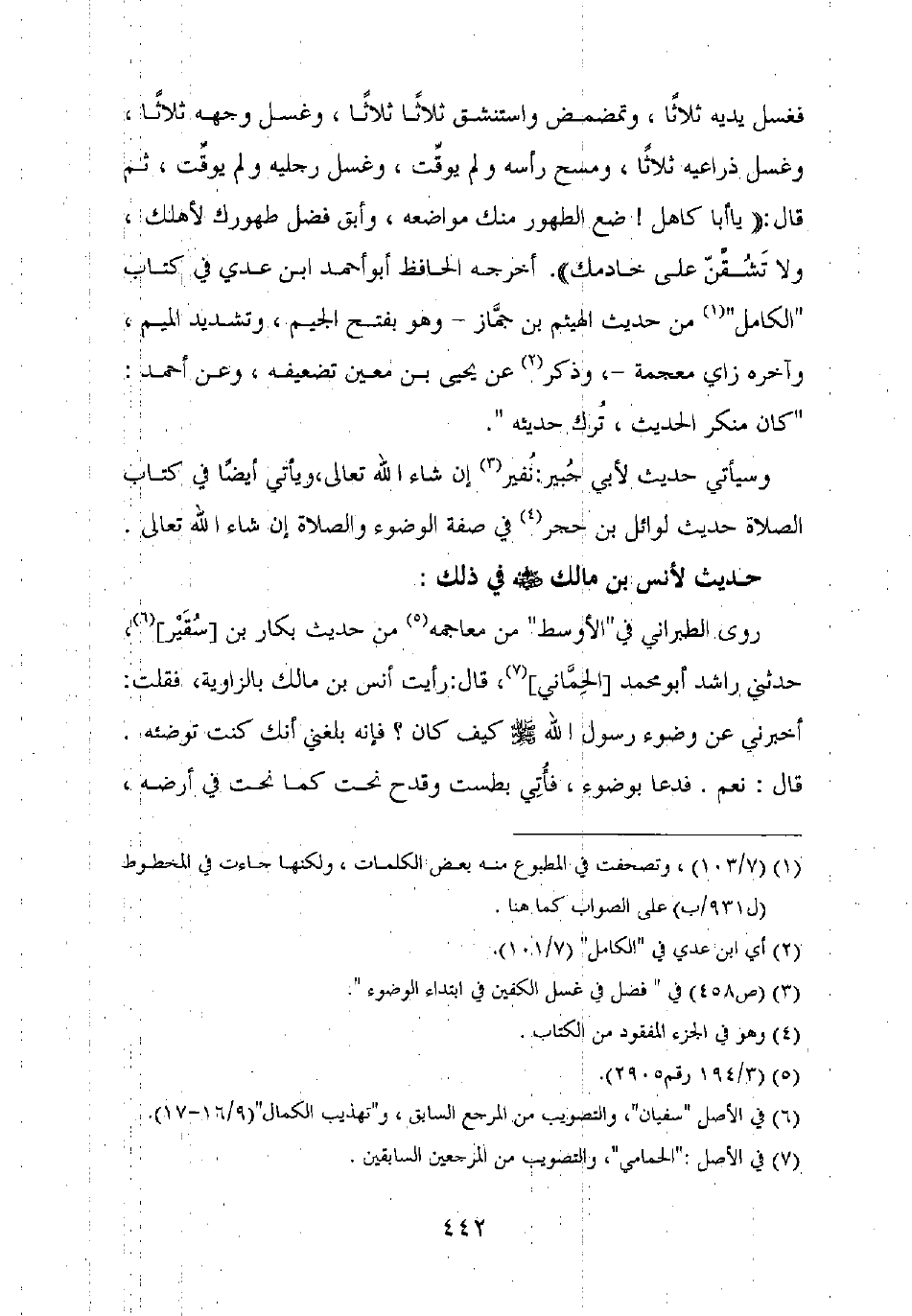فغسل يديه ثلاثا، وتمضمض واستنشق ثلاثا ثلاثا، وغسل وجهه ثلاثا، وغسل ذراعيه ثلاثا، ومسح رأسه ولم يوقت، وغسل رجليه ولم يوقت، ثم قال: "يا أبا كاهل! ضع الطهور منك مواضعه، وأبق فضل طهورك لأهلك، ولا تشقن على خادمك". أخرجه الحافظ أبو أحمد بن عدي في كتاب "الكامل" من حديث الهيثم بن جماز – وهو بفتح الجيم، وتشديد الميم، وآخره زاي معجمة –، وذكر عن يحيى بن معين تضعيفه، وعن أحمد: "كان منكر الحديث، ترك حديثه".