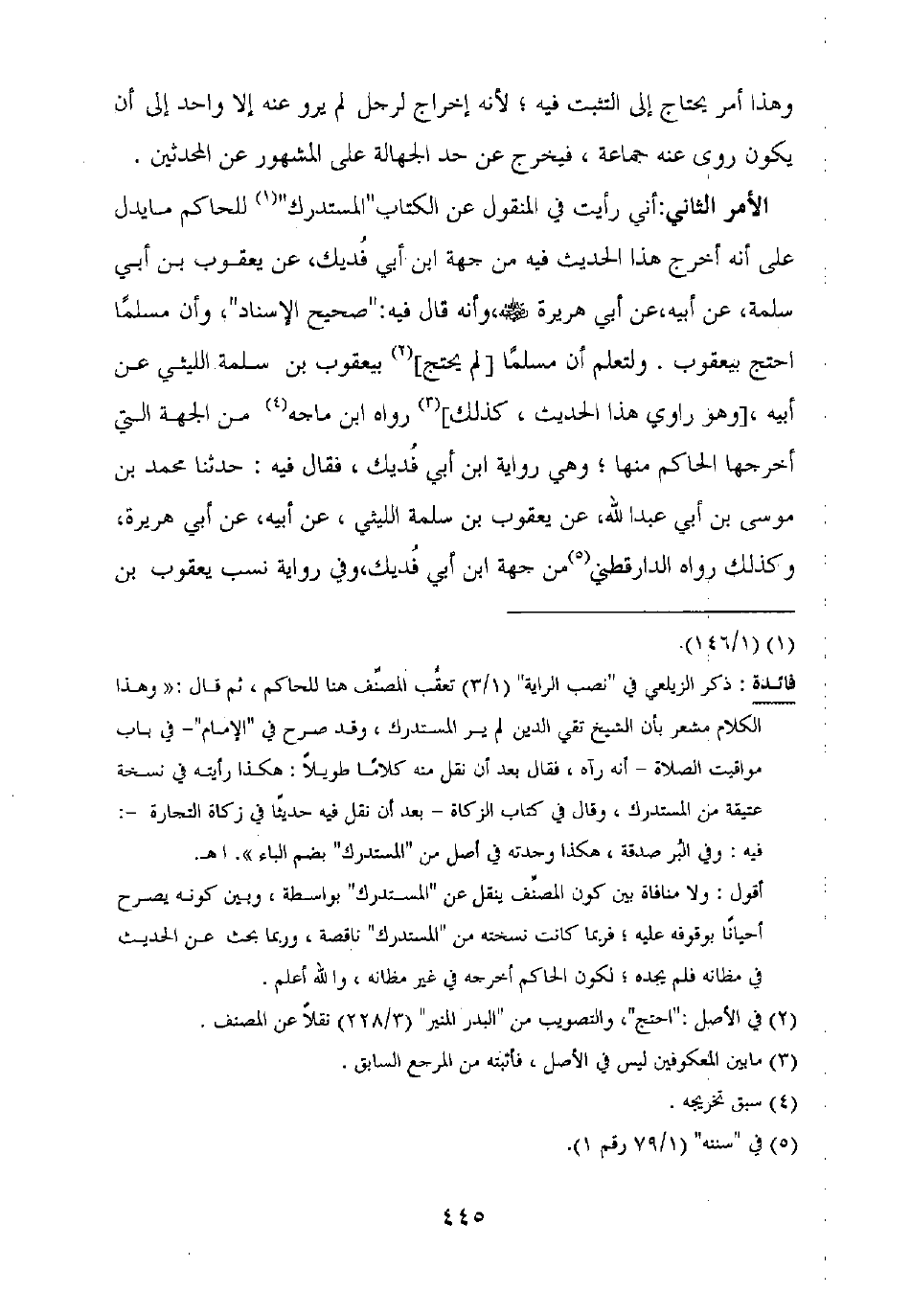الأمر الثاني: أني رأيت في المنقول عن الكتاب "المستدرك" للحاكم ما يدل على أنه أخرج هذا الحديث فيه من جهة ابن أبي فديك، عن يعقوب بن أبي سلمة، عن أبيه، عن أبي هريرة رضي الله عنه، وأنه قال فيه: "صحيح الإسناد"، وأن مسلما احتج بيعقوب. ولتعلم أن مسلما [لم يحتج] بيعقوب بن سلمة الليثي عن أبيه، [وهو راوي هذا الحديث، كذلك] رواه ابن ماجه من الجهة التي أخرجها الحاكم منها، وهي رواية ابن أبي فديك، فقال فيه: حدثنا محمد بن موسى بن أبي عبد الله، عن يعقوب بن سلمة الليثي، عن أبيه، عن أبي هريرة، وكذلك رواه الدارقطني من جهة ابن أبي فديك، وفي رواية نسب يعقوب بن
