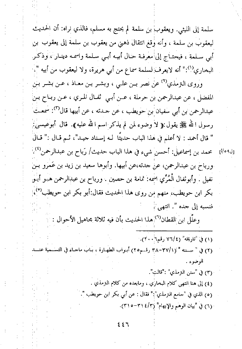 وروى الترمذي عن نصر بن علي، وبشر بن معاذ، عن بشر بن المفضل، عن عبد الرحمن بن حرملة، عن أبي ثفال المري، عن رباح بن عبد الرحمن بن أبي سفيان بن حويطب، عن جدته، عن أبيها قال: سمعت رسول الله صلى الله عليه وسلم يقول: "لا وضوء لمن لم يذكر اسم الله عليه". قال أبو عيسى: "قال أحمد: لا أعلم في هذا الباب حديثا له إسناد جيد"، ثم قال: "قال محمد بن إسماعيل: أحسن شيء في هذا الباب حديث رباح بن عبد الرحمن.