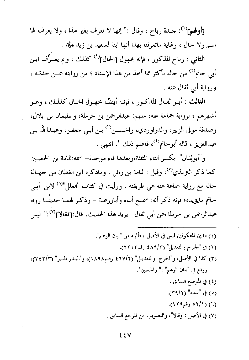 الثالث: أبو ثفال المذكور، فإنه أيضا مجهول الحال كذلك، وهو أشهرهم، لرواية جماعة عنه، منهم: عبد الرحمن بن حرملة، وسليمان بن بلال، وصدقة مولى الزبير، والدراوردي، والحسن بن أبي جعفر، وعبد الله بن عبد العزيز، قاله أبو حاتم فاعلم ذلك". انتهى.