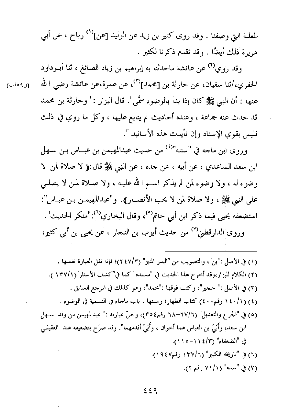 وقد روي عن عائشة ما حدثنا به إبراهيم بن زياد الصائغ، ثنا أبو داود الحفري، ثنا سفيان، عن حارثة بن [محمد]، عن عمرة، عن عائشة رضي الله عنها: أن النبي صلى الله عليه وسلم كان إذا بدأ بالوضوء سمى ". قال البزار: "وحارثة بن محمد قد حدث عنه جماعة، وعنده أحاديث لم يتابع عليها، وكل ما روي في ذلك فليس بقوي الإسناد وإن تأيدت هذه الأسانيد".