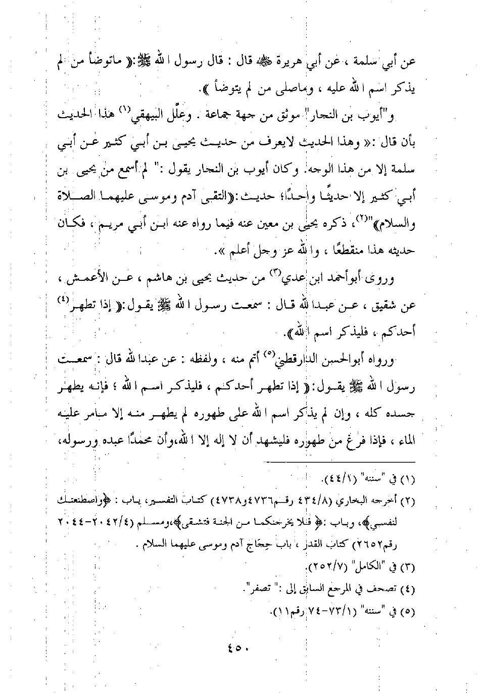 عن أبي سلمة، عن أبي هريرة رضي الله عنه قال: قال رسول الله صلى الله عليه وسلم: "ما توضأ من لم يذكر اسم الله عليه، وما صلى من لم يتوضأ".