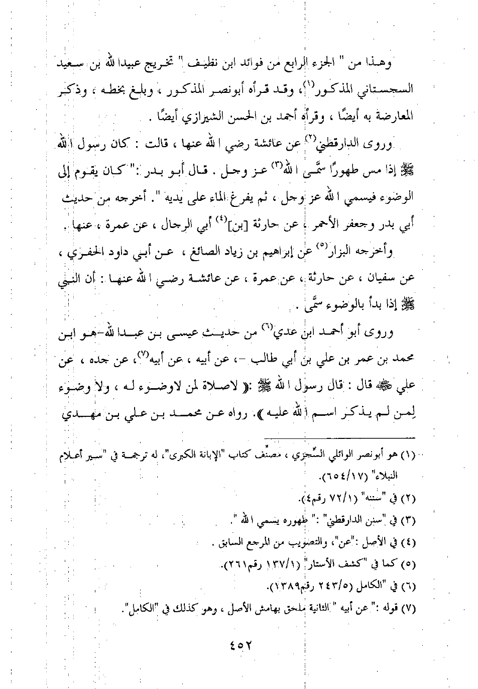 وروى أبو أحمد بن عدي من حديث عيسى بن عبد الله – هو ابن محمد بن عمر بن علي بن أبي طالب –، عن أبيه، عن أبيه، عن جده، عن علي رضي الله عنه قال: قال رسول الله صلى الله عليه وسلم "لا صلاة لمن لا وضوء له، ولا وضوء لمن لم يذكر اسم الله عليه". رواه عن محمد بن علي بن مهدي