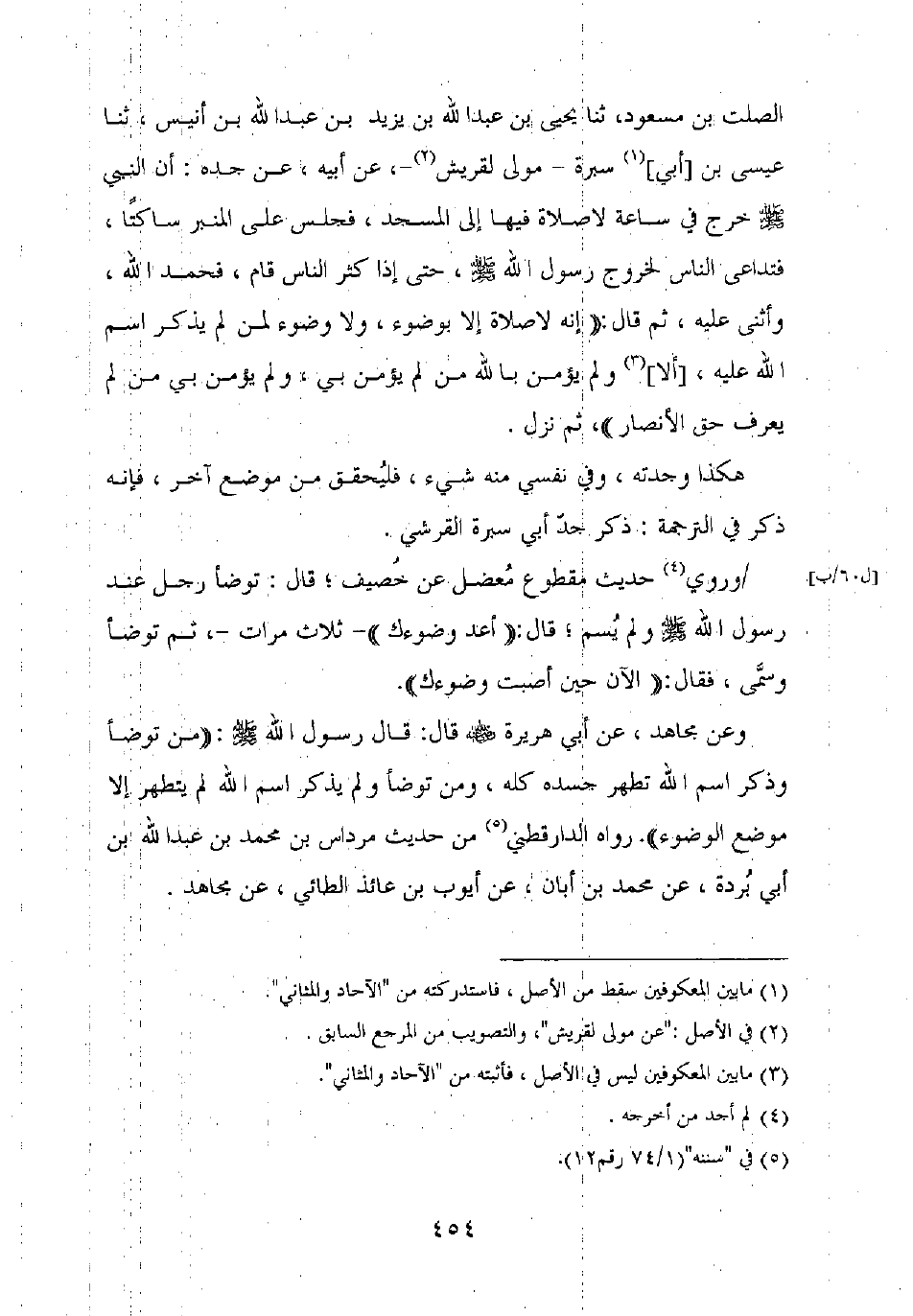 وروي حديث مقطوع معضل عن خصيف، قال: توضأ رجل عند رسول الله صلى الله عليه وسلم ولم يسم، قال: "أعد وضوءك" – ثلاث مرات –، ثم توضأ وسمى، فقال: "الآن حين أصبت وضوءك".