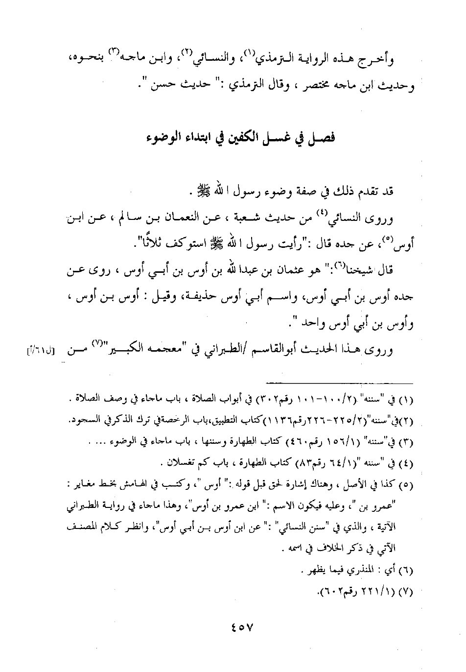 وروى النسائي من حديث شعبة، عن النعمان بن سالم، عن ابن أوس، عن جده قال: "رأيت رسول الله صلى الله عليه وسلم استوكف ثلاثا".