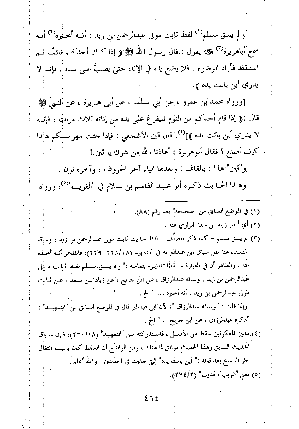 [ورواه محمد بن عمرو، عن أبي سلمة، عن أبي هريرة، عن النبي صلى الله عليه وسلم قال: "إذا قام أحدكم من النوم فليفرغ على يده من إنائه ثلاث مرات، فإنه لا يدري أين باتت يده"]. قال قين الأشجعي: فإذا جئت مهراسكم هذا كيف أصنع؟ فقال أبو هريرة: أعاذنا الله من شرك يا قين!