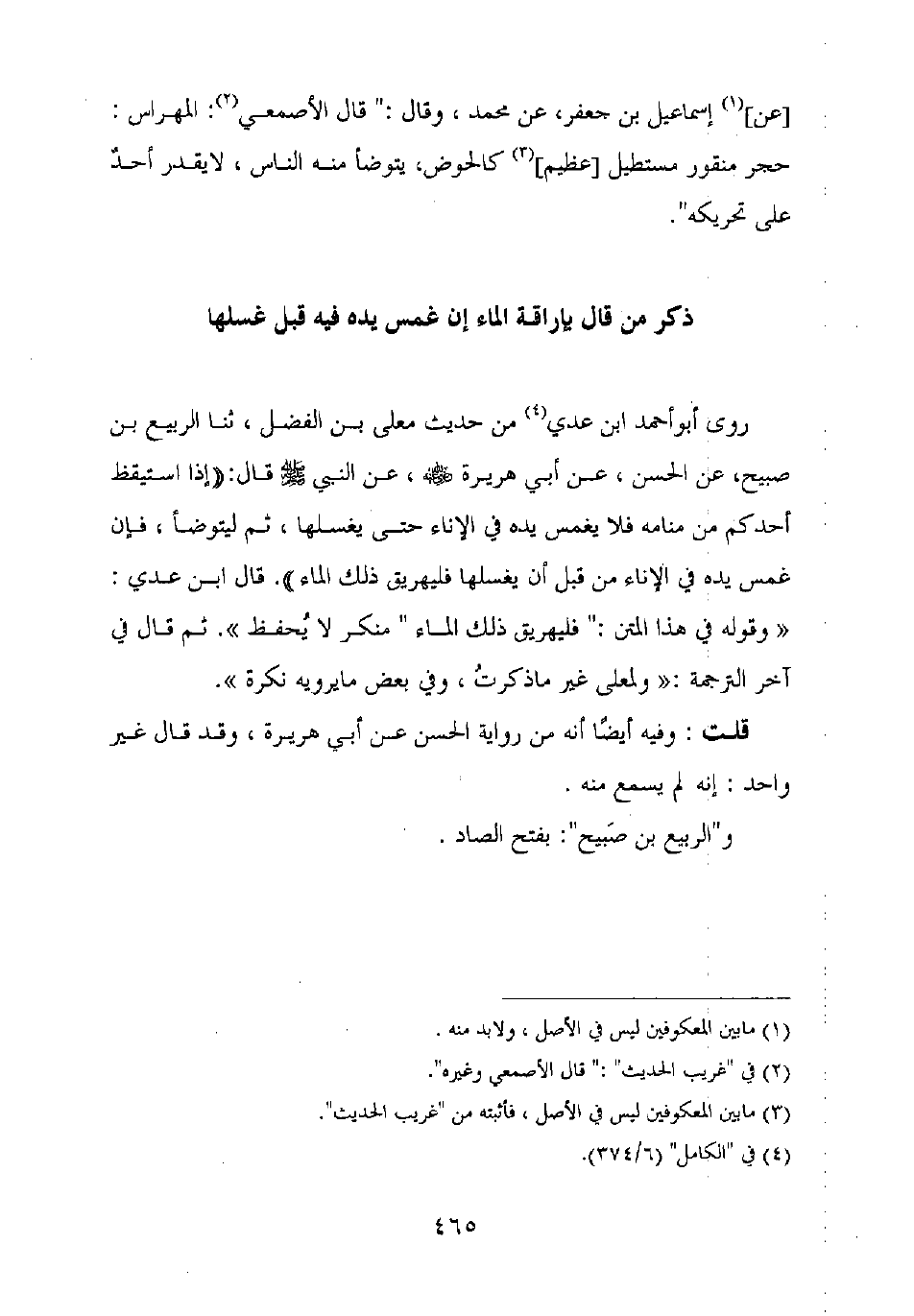 روى أبو أحمد بن عدي من حديث معلى بن الفضل، ثنا الربيع بن صبيح، عن الحسن، عن أبي هريرة رضي الله عنه، عن النبي صلى الله عليه وسلم قال: "إذا استيقظ أحدكم من منامه فلا يغمس يده في الإناء حتى يغسلها، ثم ليتوضأ، فإن غمس يده في الإناء من قبل أن يغسلها فليهريق ذلك الماء". قال ابن عدي: "وقوله في هذا المتن: "فليهريق ذلك الماء" منكر لا يحفظ ". ثم قال في آخر الترجمة: "ولمعلى غير ما ذكرت، وفي بعض ما يرويه نكرة".