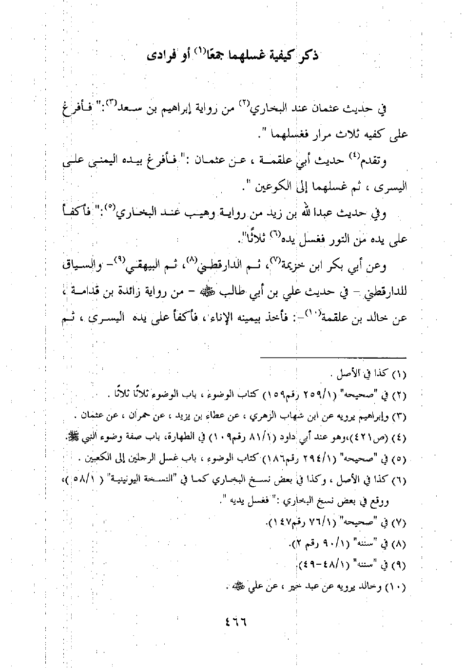 وتقدم حديث أبي علقمة، عن عثمان: "فأفرغ بيده اليمنى على اليسرى، ثم غسلهما إلى الكوعين".