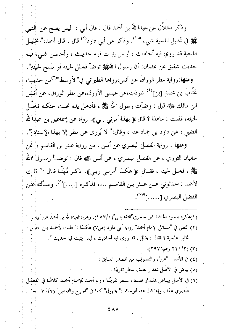 ومنها: رواية محمد بن زياد، عن أنس بن مالك قال: كان رسول الله صلى الله عليه وسلم إذا توضأ خلل لحيته بأصابع كفيه، ويقول: "بهذا أمرني ربي عز وجل"]. رواه أبو أحمد ابن عدي من حديث هاشم بن سعيد، عن محمد، وقال: "هاشم بن سعيد له من الحديث غير ما ذكرت، ومقدار ما يرويه من الحديث لا يتابع عليه".