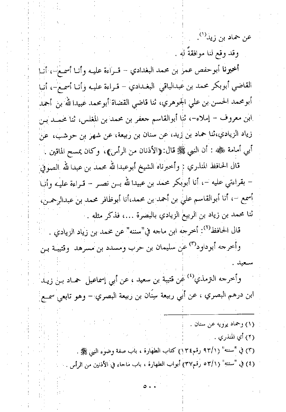عن سنان بن ربيعة، عن شهر بن حوشب، عن أبي أمامة رضي الله عنه: أن رسول الله صلى الله عليه وسلم قال: "الأذنان من الرأس"، [وكان يمسح رأسه مرة]، وكان يمسح الماقين. لفظ أبي عبد الله ابن ماجه. رواه عن محمد بن زياد الزيادي،
