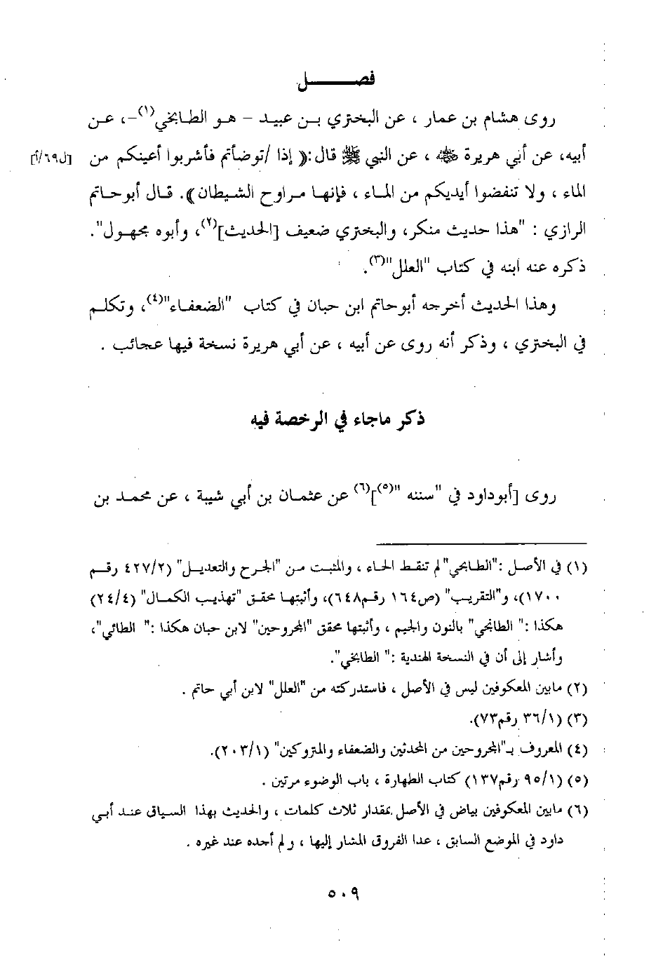 روى هشام بن عمار، عن البختري بن عبيد – هو الطابخي –، عن أبيه، عن أبي هريرة رضي الله عنه، عن النبي صلى الله عليه وسلم قال: "إذا توضأتم فأشربوا أعينكم من الماء، ولا تنفضوا أيديكم من الماء، فإنه مراوح الشيطان". قال أبو حاتم الرازي: "هذا حديث منكر، والبختري ضعيف [الحديث]، وأبوه مجهول".