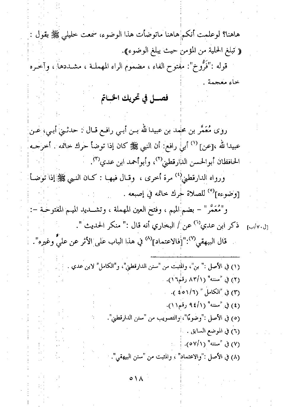روى معمر بن محمد بن عبيد الله بن أبي رافع قال: حدثني أبي، عن عبيد الله، [عن] أبي رافع: أن النبي صلى الله عليه وسلم كان إذا توضأ حرك خاتمه. أخرجه الحافظان أبو الحسن الدارقطني، وأبو احمد ابن عدي.