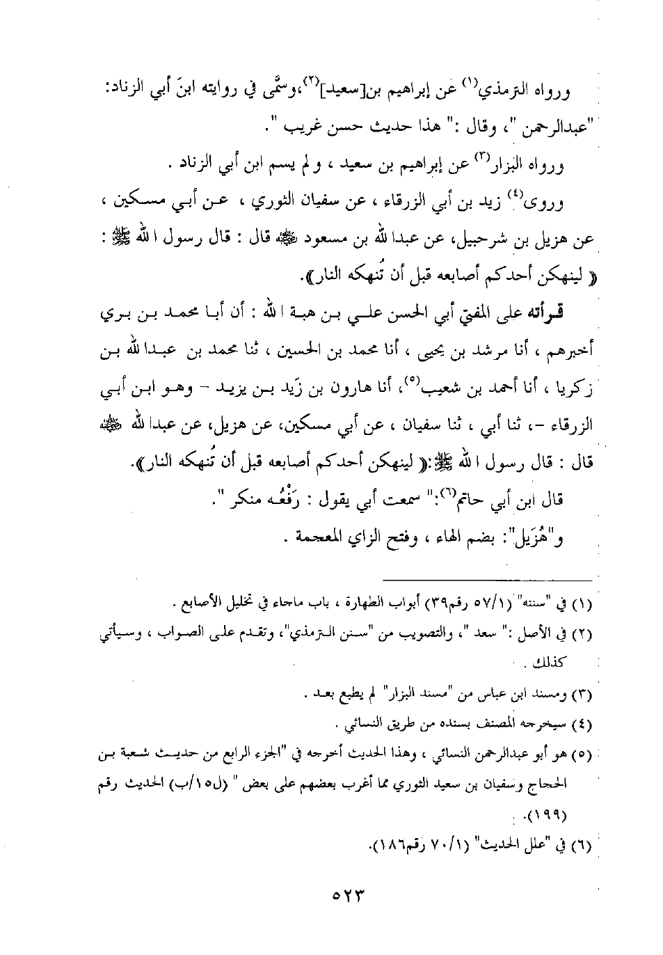 قرأته على المفتي أبي الحسن علي بن هبة الله: أن أبا محمد بن بري أخبرهم، أنا مرشد بن يحيى، أنا محمد بن الحسين، ثنا محمد بن عبد الله بن زكريا، أنا أحمد بن شعيب، أنا هارون بن زيد بن يزيد – وهو ابن أبي الزرقاء –، ثنا أبي، ثنا سفيان، عن أبي مسكين، عن هزيل، عن عبد الله رضي الله عنه قال: قال رسول الله صلى الله عليه وسلم: "لينهكن أحدكم أصابعه قبل أن تنهكه النار".