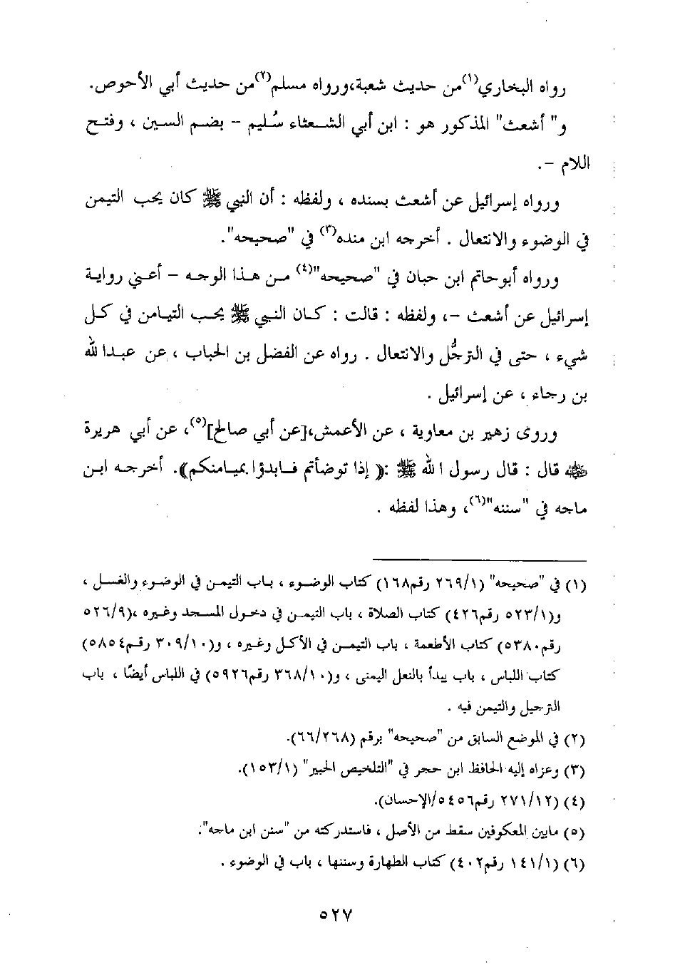 ورواه أبو حاتم ابن حبان في "صحيحه" من هذا الوجه –أعني رواية إسرائيل عن أشعث –، ولفظه: قالت: كان النبي صلى الله عليه وسلم يحب التيامن في كل شيء، حتى في الترجل والانتعال. رواه عن الفضل بن الحباب، عن عبد الله بن رجاء، عن إسرائيل.