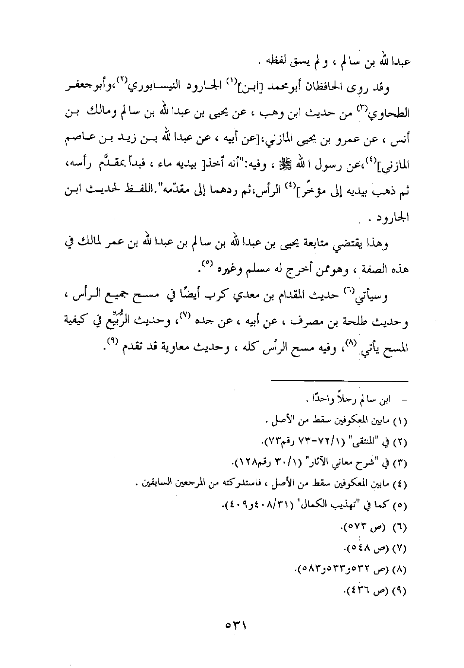 وقد روى الحافظان أبو محمد [ابن] الجارود النيسابوري، وأبو جعفر الطحاوي من حديث ابن وهب، عن يحيى بن عبد الله بن سالم ومالك بن أنس، عن عمرو بن يحيى المازني، [عن أبيه، عن عبد الله بن زيد بن عاصم المازني]، عن رسول الله صلى الله عليه وسلم، وفيه: "أنه أخذ [بيديه ماء، فبدأ بمقدم رأسه، ثم ذهب بيديه إلى مؤخر] الرأس، ثم ردهما إلى مقدمه". اللفظ لحديث ابن الجارود.