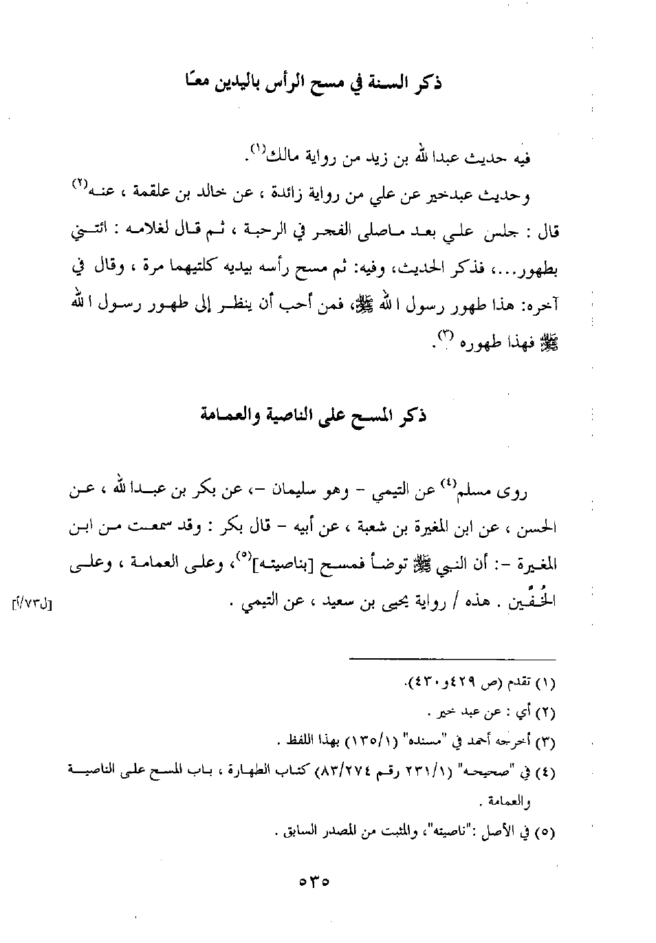 روى مسلم عن التيمي – وهو سليمان –، عن بكر بن عبد الله، عن الحسن، عن ابن المغيرة بن شعبة، عن أبيه – قال بكر: وقد سمعت من ابن المغيرة –: أن النبي صلى الله عليه وسلم توضأ فمسح [بناصيته]، وعلى العمامة، وعلى الخفين. هذه رواية يحيى بن سعيد، عن التيمي.
