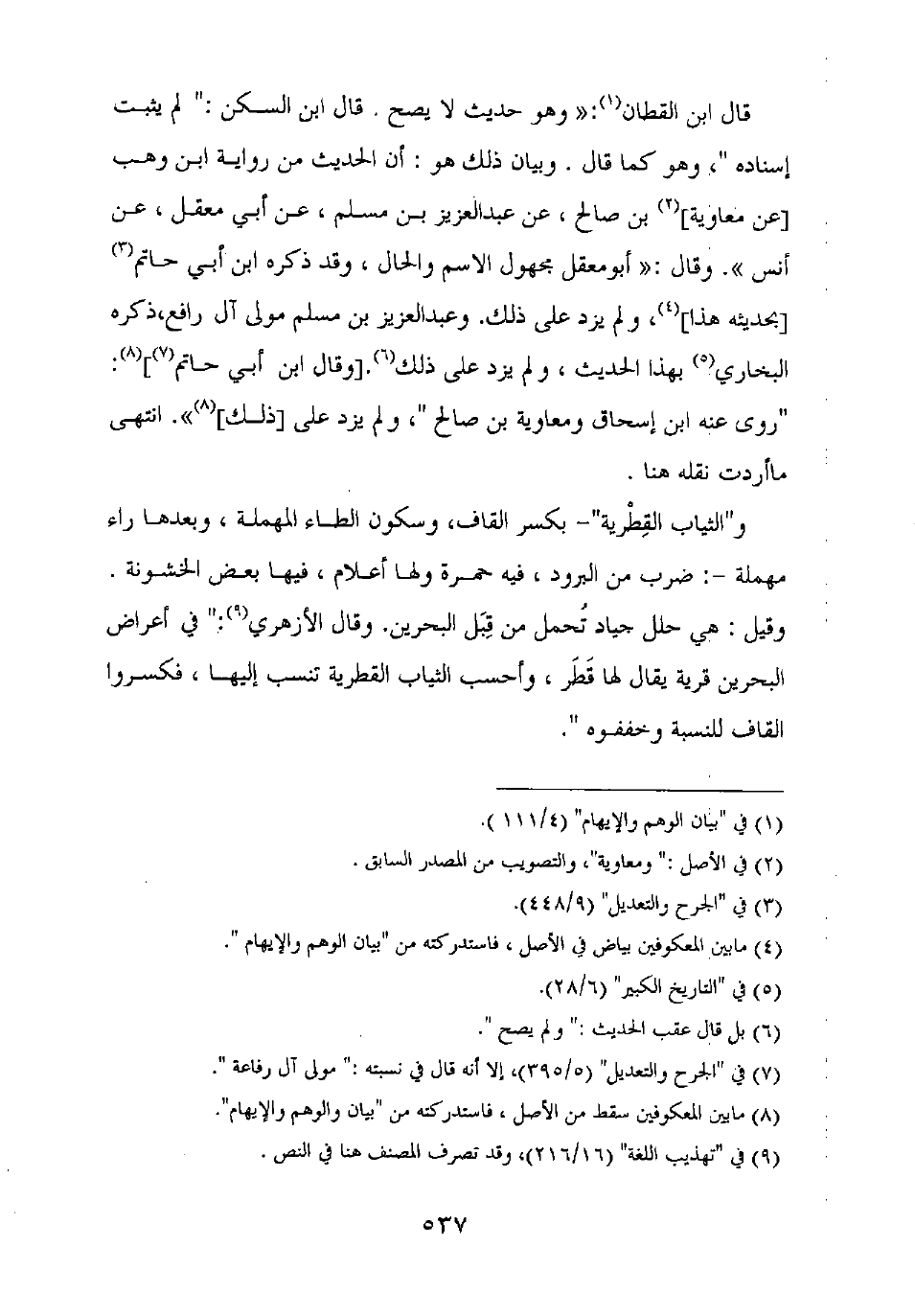و"الثياب القطرية" – بكسر القاف، وسكون الطاء المهملة، وبعدها راء مهملة –: ضرب من البرود، فيه حمرة ولها أعلام، فيها بعض الخشونة.