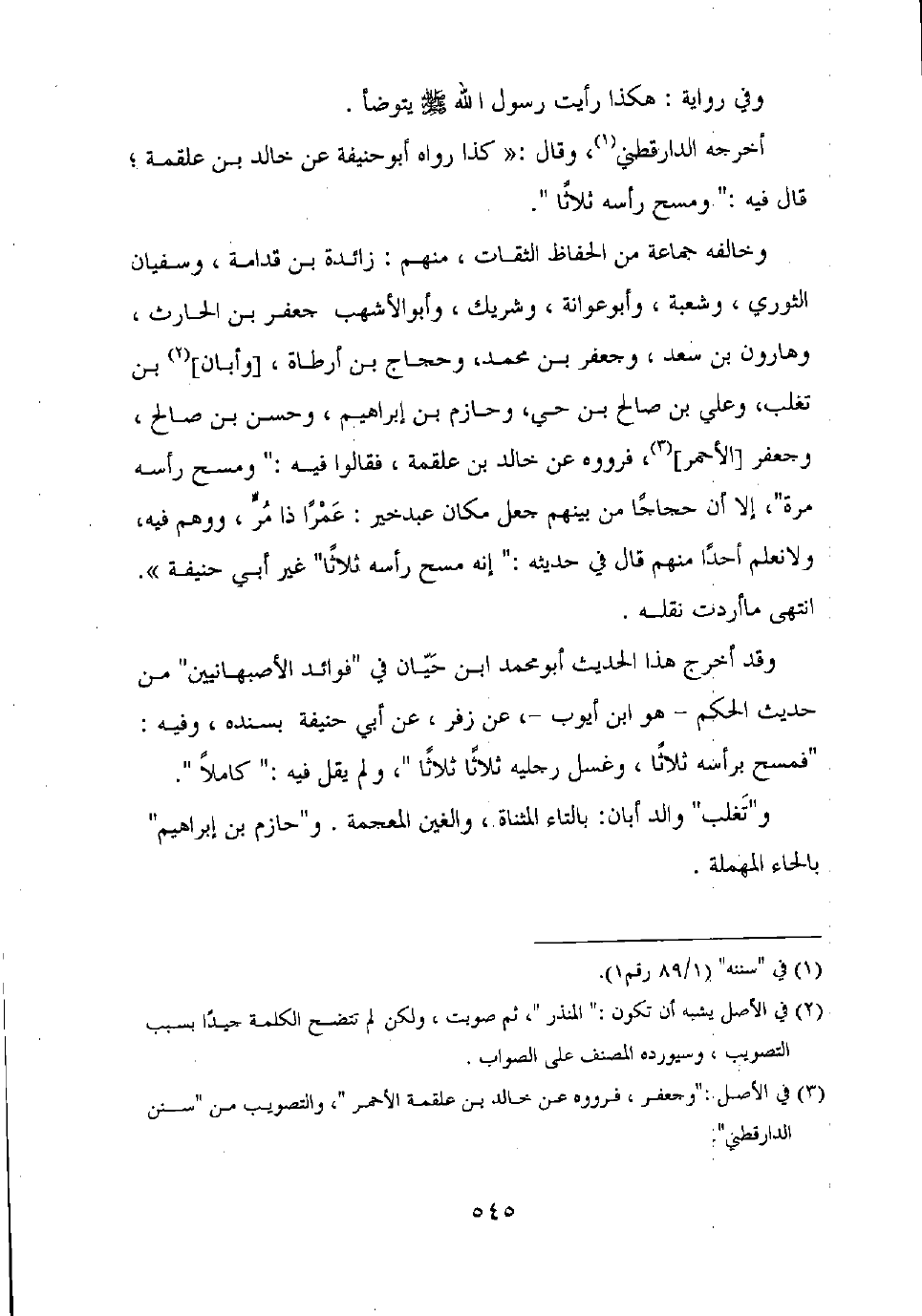 وخالفه جماعة من الحفاظ الثقات، منهم: زائدة بن قدامة، وسفيان الثوري، وشعبة، وأبو عوانة، وشريك، وأبو الأشهب جعفر بن الحارث، وهارون بن سعد، وجعفر بن محمد، وحجاج بن أرطأة، [وأبان] بن تغلب، وعلي بن صالح بن حي، وحازم بن إبراهيم، وحسن بن صالح، وجعفر [الأحمر]، فرووه عن خالد بن علقمة، فقالوا فيه: "ومسح رأسه مرة"، إلا أن حجاجا من بينهم جعل مكان عبد خير: عمرا ذا مر، ووهم فيه، ولا نعلم أحدا منهم قال في حديثه: "إنه مسح رأسه ثلاثا" غير أبي حنيفة ".