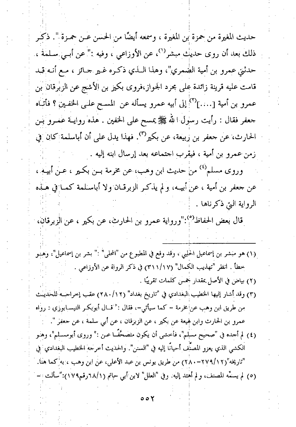 حديث المغيرة من حمزة بن المغيرة، وسمعه أيضا من الحسن عن حمزة ". ذكر ذلك بعد أن روى حديث مبشر، عن الأوزاعي، وفيه: "عن أبي سلمة، حدثني عمرو بن أمية الضمري"، وهذا الذي ذكره غير جائز، مع أنه قد قامت عليه قرينة زائدة على مجرد الجواز، فروى بكير بن الأشج عن الزبرقان بن عمرو بن أمية [ ..... ] إلى أبيه عمرو يسأله عن المسح على الخفين؟ فأتاه جعفر فقال: رأيت رسول الله صلى الله عليه وسلم يمسح على الخفين. هذه رواية عمرو بن الحارث، عن جعفر بن ربيعة، عن بكير. فهذا يدل على أن أبا سلمة كان في زمن عمرو بن أمية، فيقرب اجتماعه بعد إرسال ابنه إليه.