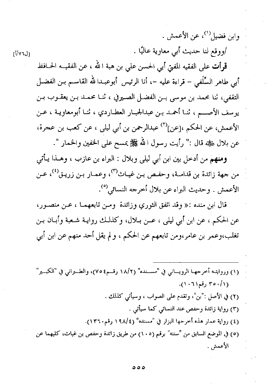 قرأت على الفقيه المفتي أبي الحسن علي بن هبة الله، عن الفقيه الحافظ أبي طاهر السلفي – قراءة عليه –، أنا الرئيس أبو عبد الله القاسم بن الفضل الثقفي، ثنا محمد بن موسى بن الفضل الصيرفي، ثنا محمد بن يعقوب بن يوسف الأصم، ثنا احمد بن عبد الجبار العطاردي، ثنا أبو معاوية، عن الأعمش، عن الحكم، [عن] عبد الرحمن بن أبي ليلى، عن كعب بن عجرة، عن بلال رضي الله عنه قال: "رأيت رسول الله صلى الله عليه وسلم يمسح على الخفين والخمار".