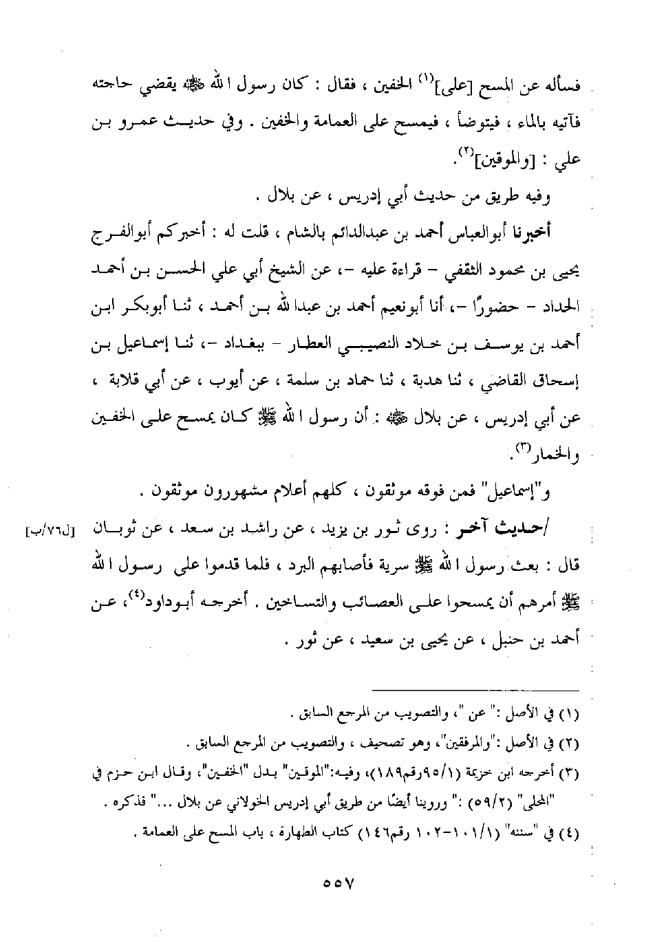 أخبرنا أبو العباس أحمد بن عبد الدائم بالشام، قلت له: أخبركم أبو الفرج يحيى بن محمود الثقفي – قراءة عليه –، عن الشيخ أبي علي الحسن بن أحمد الحداد – حضورا –، أنا أبو نعيم أحمد بن عبد الله بن أحمد، ثنا أبو بكر بن أحمد بن يوسف بن خلاد النصيبي العطار – ببغداد –، ثنا إسماعيل بن إسحاق القاضي، ثنا هدبة، ثنا حماد بن سلمة، عن أيوب، عن أبي قلابة، عن أبي إدريس، عن بلال رضي الله عنه: أن رسول الله صلى الله عليه وسلم كان يمسح على الخفين والخمار.
