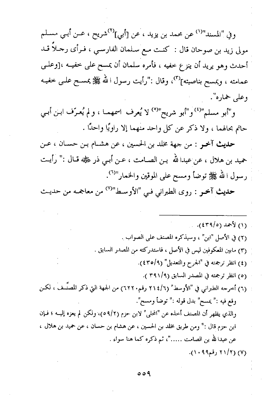 وفي "المسند" عن محمد بن يزيد، عن [أبي] شريح، عن أبي مسلم مولى زيد بن صوحان قال: كنت مع سلمان الفارسي، فرأى رجلا قد أحدث وهو يريد أن ينزع خفيه، فأمره سلمان أن يمسح على خفيه، [وعلى عمامته، ويمسح بناصيته]، وقال: "رأيت رسول الله صلى الله عليه وسلم يمسح على خفيه وعلى خماره".