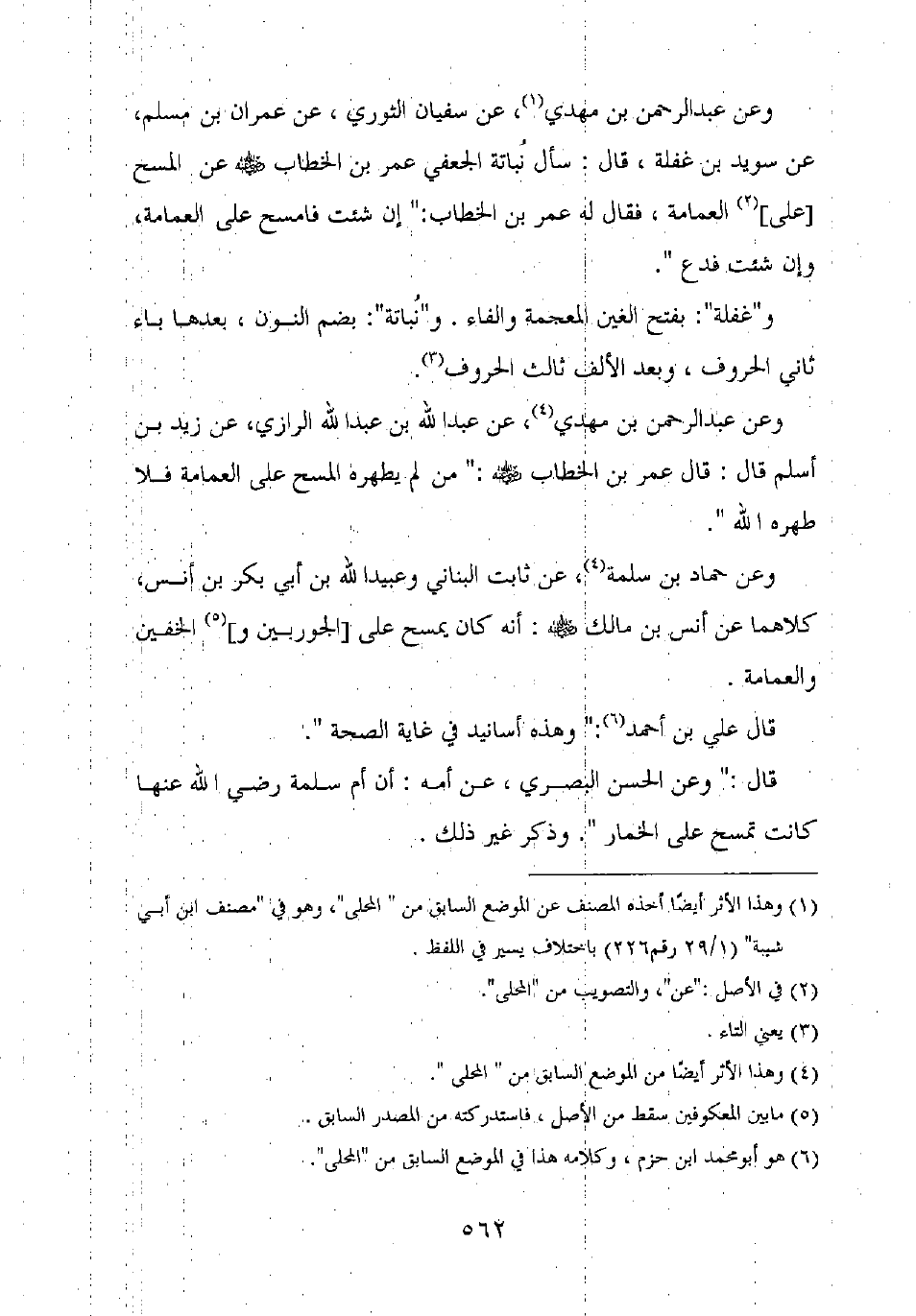 وعن عبد الرحمن بن مهدي، عن سفيان الثوري، عن عمران بن مسلم، عن سويد بن غفلة، قال: سأل نباتة الجعفي عمر بن الخطاب رضي الله عنه عن المسح [على] العمامة، فقال له عمر بن الخطاب: "إن شئت فامسح على العمامة، وإن شئت فدع".
