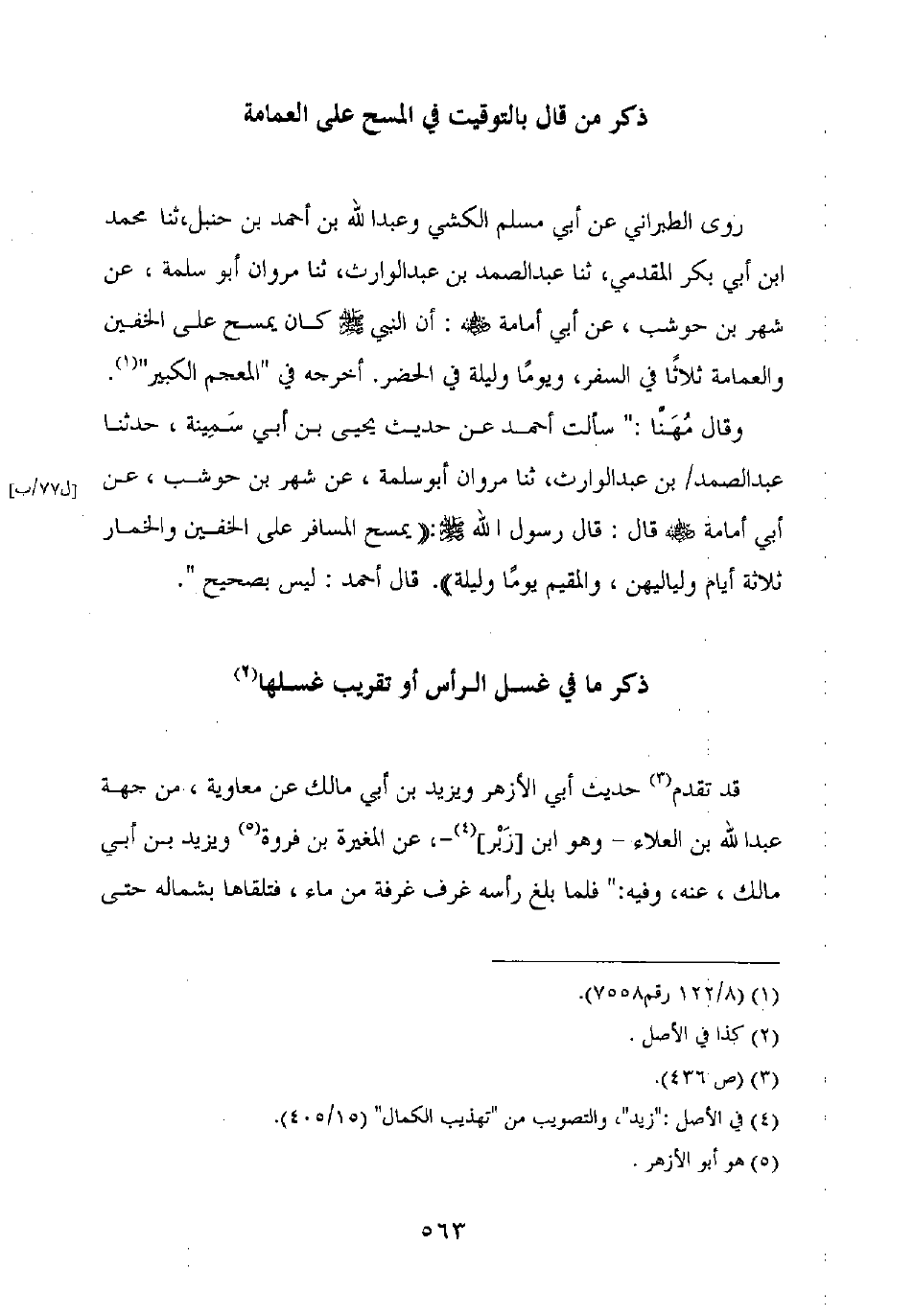 وقال مهنا: "سألت أحمد عن حديث يحيى بن أبي سمينة، حدثنا عبد الصمد بن عبد الوارث، ثنا مروان أبو سلمة، عن شهر بن حوشب، عن أبي أمامة رضي الله عنه قال: قال رسول الله صلى الله عليه وسلم: "يمسح المسافر على الخفين والخمار ثلاثة أيام ولياليهن، والمقيم يوما وليلة". قال أحمد: ليس بصحيح".