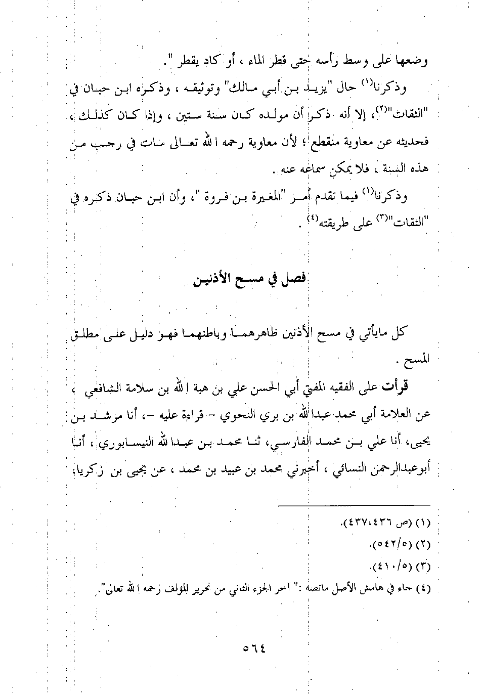 قرأت على الفقيه المفتي أبي الحسن علي بن هبة الله بن سلامة الشافعي، عن العلامة أبي محمد عبد الله بن بري النحوي – قراءة عليه –، أنا مرشد بن يحيى، أنا على بن محمد الفارسي، ثنا محمد بن عبد الله النيسابوري، أنا أبو عبد الرحمن النسائي، أخبرني محمد بن عبيد بن محمد، عن يحيى بن زكريا،