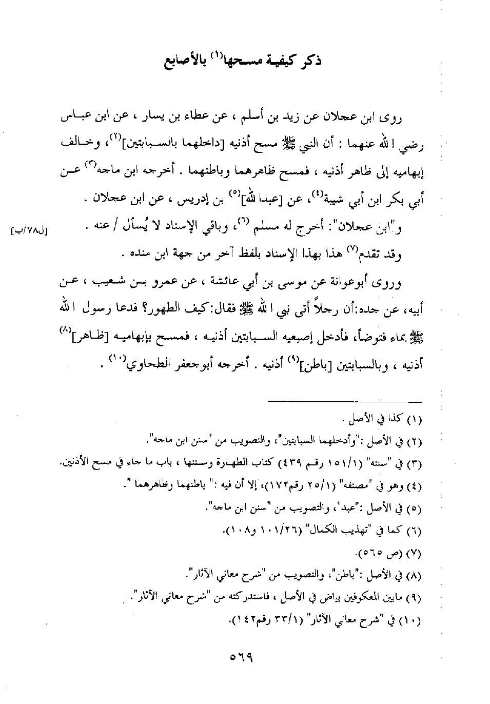 روى ابن عجلان عن زيد بن أسلم، عن عطاء بن يسار، عن ابن عباس رضي الله عنهما: أن النبي صلى الله عليه وسلم مسح أذنيه [داخلهما بالسبابتين]، وخالف إبهاميه إلى ظاهر أذنيه، فمسح ظاهرهما وباطنهما. أخرجه ابن ماجه عن أبي بكر ابن أبي شيبة، عن [عبد الله] بن إدريس، عن ابن عجلان.