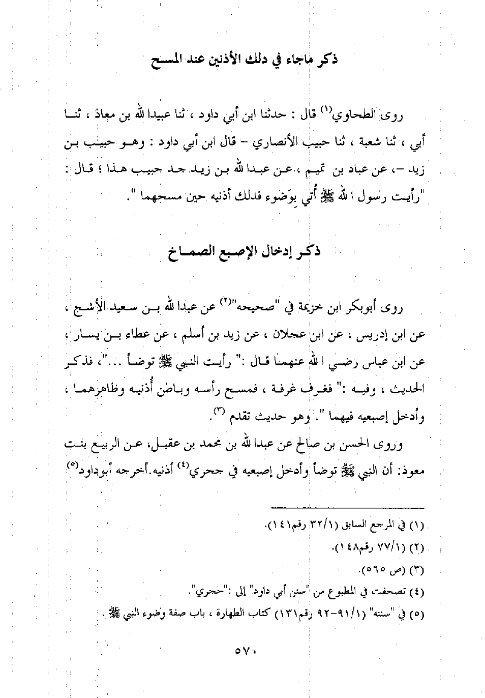روى الطحاوي قال: حدثنا ابن أبي داود، ثنا عبيد الله بن معاذ، ثنا أبي، ثنا شعبة، ثنا حبيب الأنصاري – قال ابن أبي داود: وهو حبيب بن زيد –، عن عباد بن تميم، عن عبد الله بن زيد جد حبيب هذا، قال: "رأيت رسول الله صلى الله عليه وسلم أتي بوضوء فدلك أذنيه حين مسحهما".
