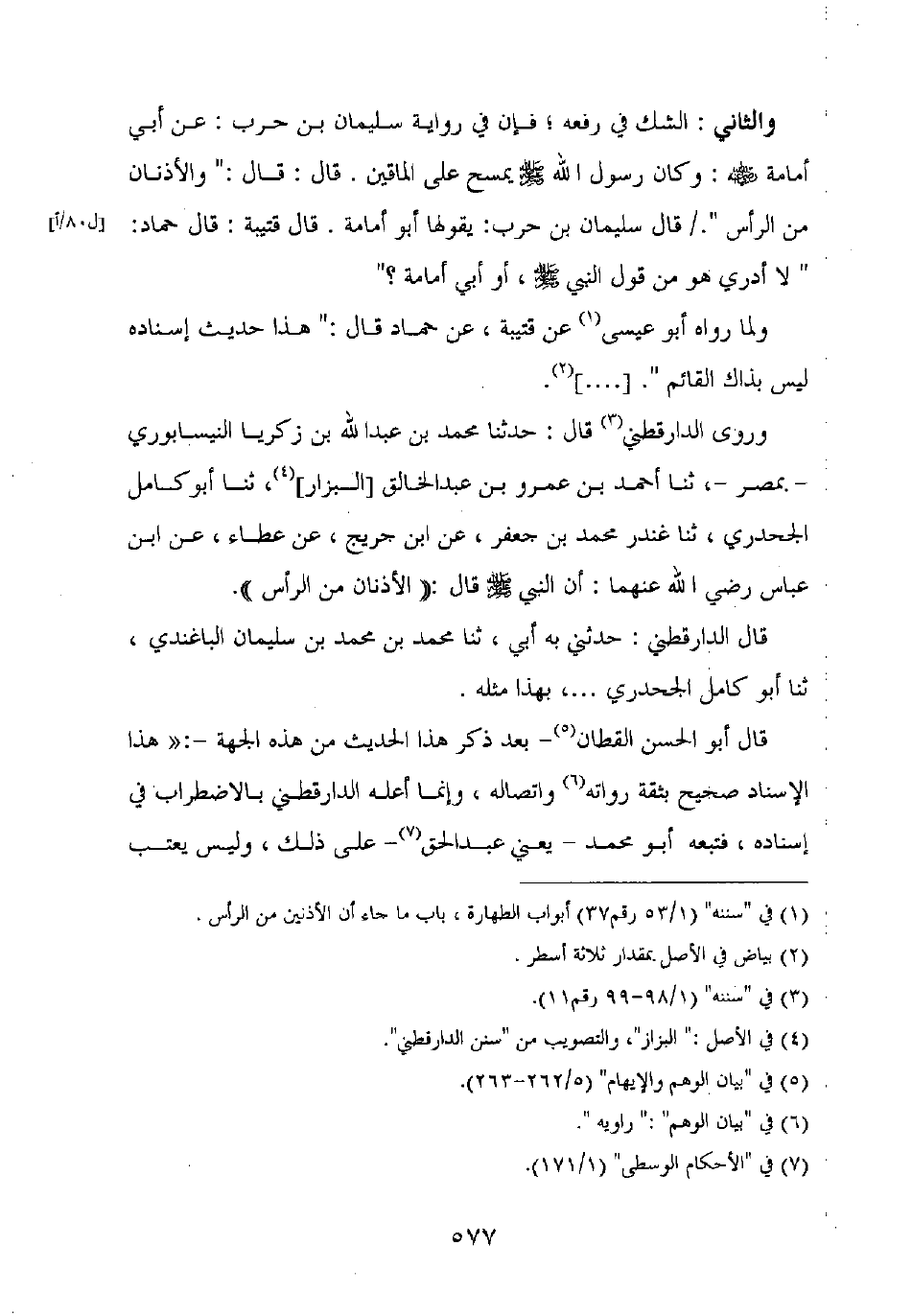 والثاني: الشك في رفعه، فإن في رواية سليمان بن حرب: عن أبي أمامة رضي الله عنه: وكان رسول الله صلى الله عليه وسلم يمسح على الماقين. قال: قال: "والأذنان من الرأس". قال سليمان بن حرب: يقولها أبو أمامة. قال قتيبة قال حماد: "لا أدري هو من قول النبي صلى الله عليه وسلم، أو أبي أمامة؟ "
