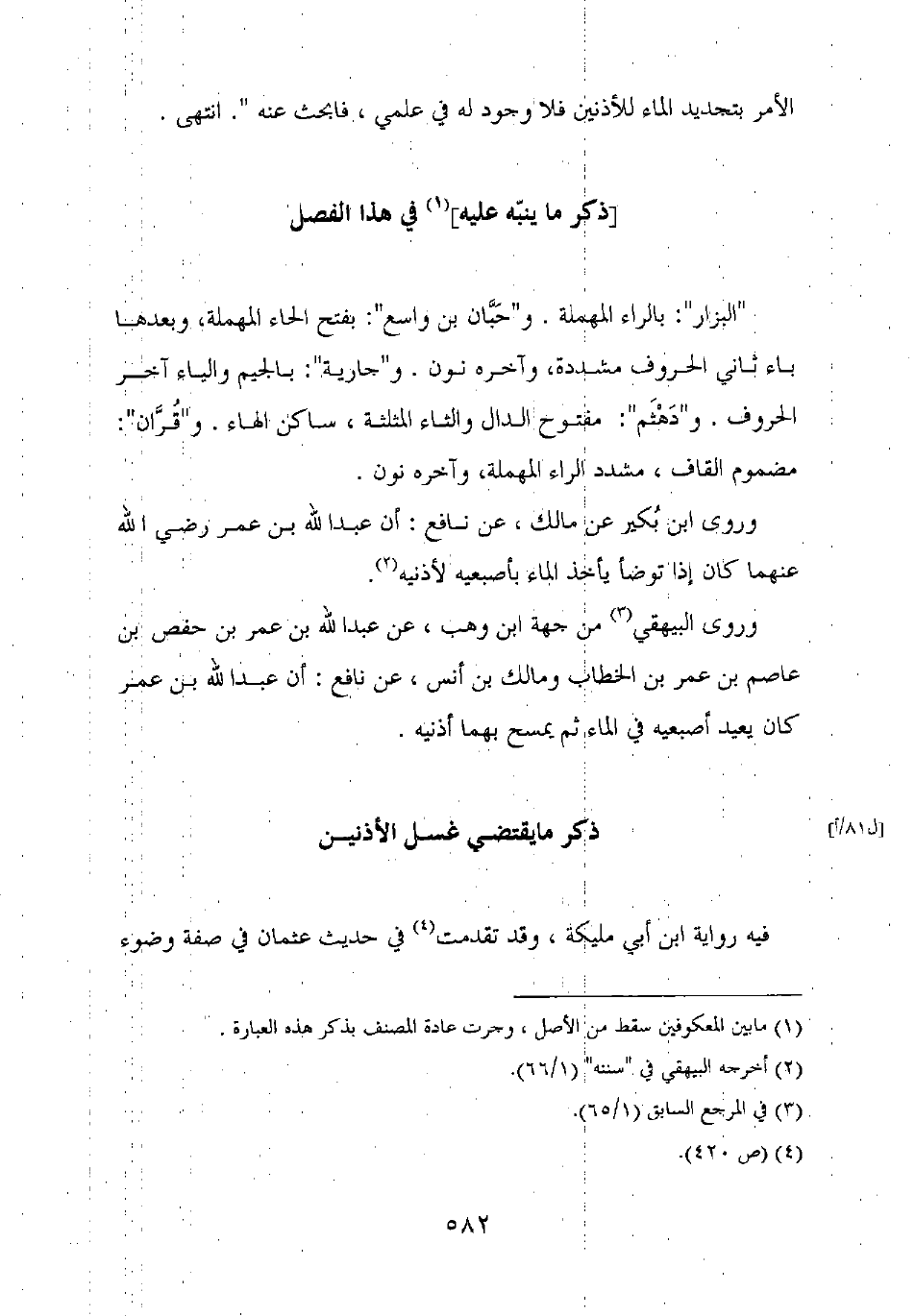 وروى البيهقي من جهة ابن وهب، عن عبد الله بن عمر بن حفص بن عاصم بن عمر بن الخطاب ومالك بن أنس، عن نافع: أن عبد الله بن عمر كان يعيد أصبعيه في الماء ثم يمسح بهما أذنيه.