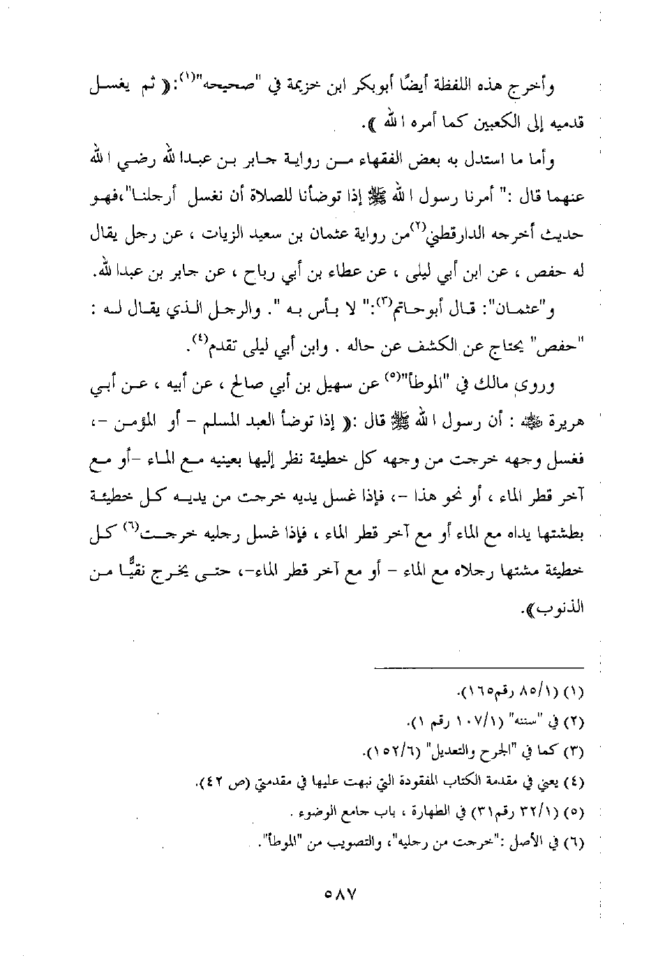 وأما ما استدل به بعض الفقهاء من رواية جابر بن عبد الله رضي الله عنهما قال: "أمرنا رسول الله صلى الله عليه وسلم إذا توضأنا للصلاة أن نغسل أرجلنا"، فهو حديث أخرجه الدارقطني من رواية عثمان بن سعيد الزيات، عن رجل يقال له حفص، عن ابن أبي ليلى، عن عطاء بن أبي رباح، عن جابر بن عبد الله.