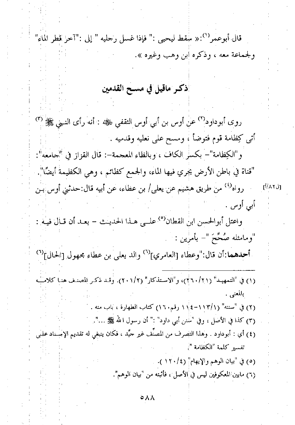 روى أبو داود عن أوس بن أبي أوس الثقفي رضي الله عنه: أنه رأى النبي صلى الله عليه وسلم أتى كظامة قوم فتوضأ، ومسح على نعليه وقدميه.